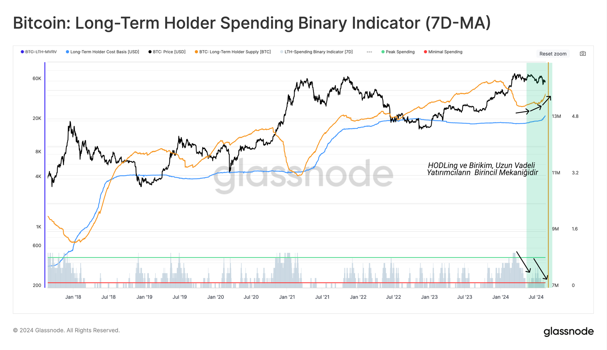 Uzun Vadeli Yatırımcılar için Binary Spending Indicator'ı kullanarak, yukarıda bahsedilen Uzun Vadeli Yatırımcı harcamalarındaki yavaşlamayı gözlemleyebiliriz.