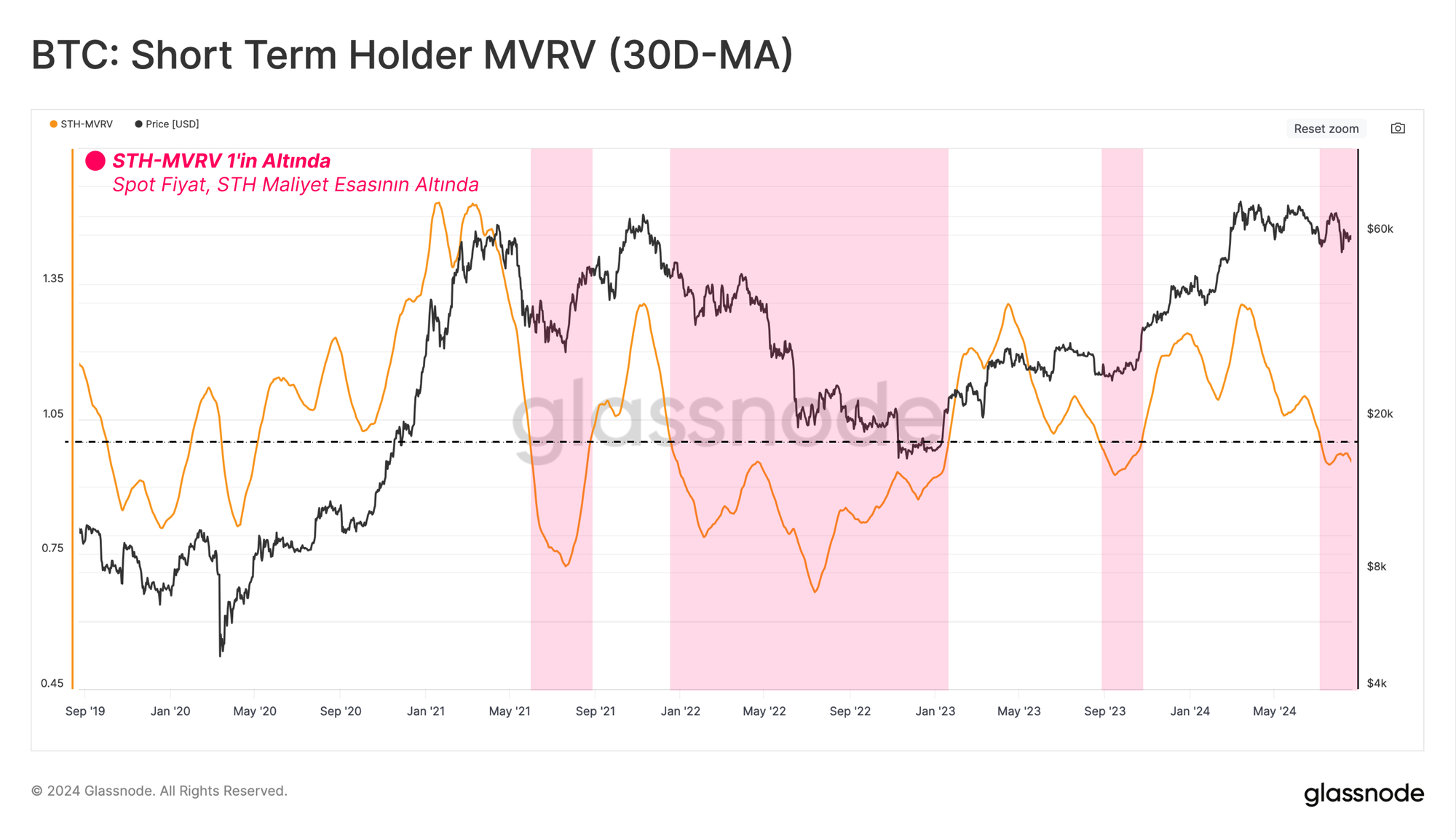 STH-MVRV son dönemde 1.0'lık denge değerinin altına düştü, bu da ortalama yeni yatırımcıların şu anda gerçekleşmemiş bir zarar taşıdığını gösteriyor.