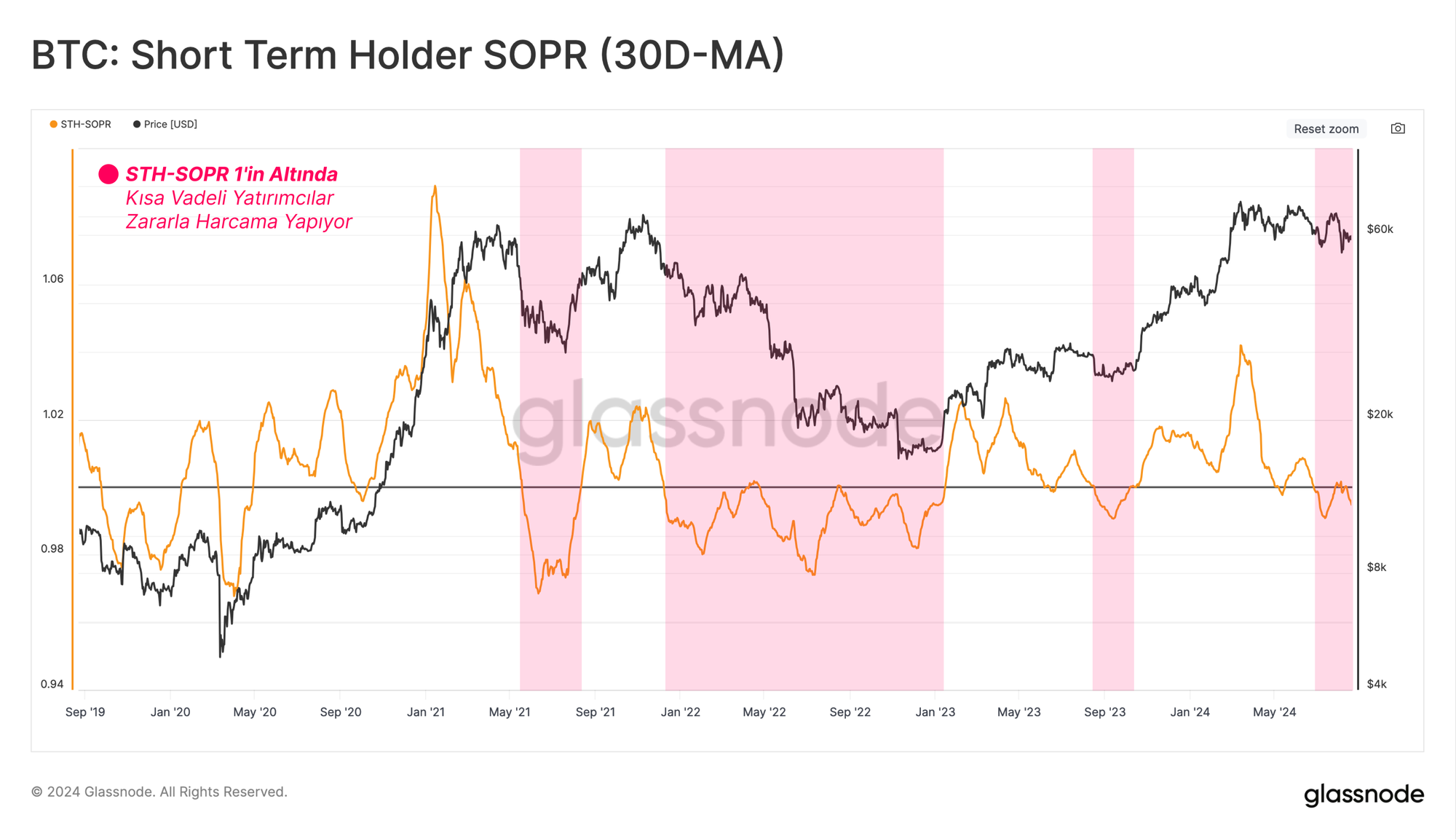 Yeni yatırımcılar tarafından piyasalarda yüksek kayıp realizasyonunun yaşandığı dönemler, STH-SOPR'nin 1.0'ın altında işlem gördüğü zamanlarda gözlemlenebilir.