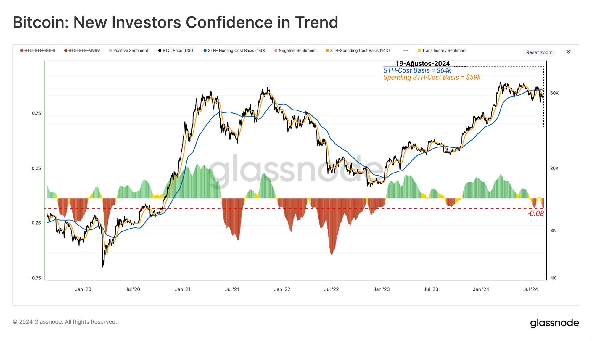 Aşağıdaki grafik, işlem yapmaya karar veren yeni yatırımcıların harcanan maliyet esasını, hala elinde tutan tüm yatırımcıların ortalama maliyet esasıyla karşılaştırır. Bu iki metrik arasındaki sapma, potansiyel aşırı tepkilerin büyüklüğü hakkında bilgi sağlar.