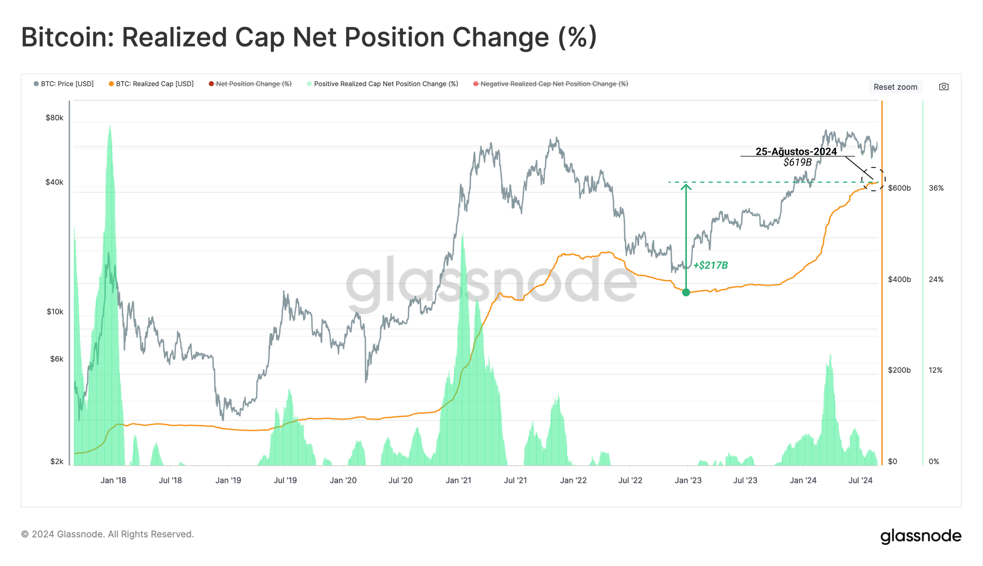 Gerçekleşmiş Piyasa Değeri (Realized Cap) 619 milyar $ ile tüm zamanların en yüksek seviyesinde (ATH) kalmaya devam ediyor. Bu, Aralık 2022'deki 15 bin $ dip seviyesinden bu yana 217 milyar $'lık dikkat çekici bir net sermaye girişiyle desteklenmektedir.