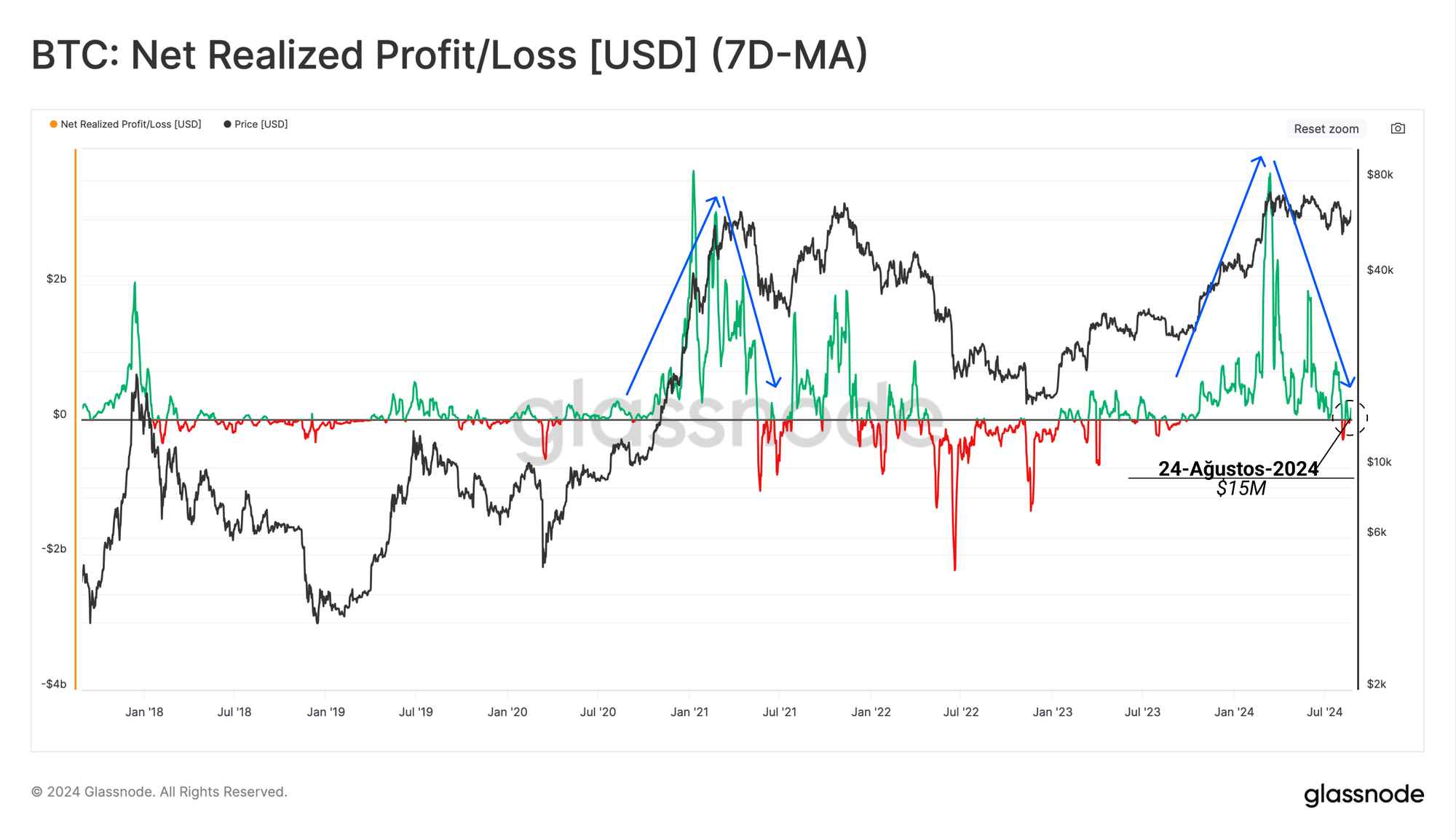 Son birkaç ayda, Bitcoin varlığına olan net sermaye girişleri yavaşlamaya başladı. Bu durum, yatırımcılar arasında kâr ve zarar realizasyonu arasında bir dengeye ulaşıldığını düşündürmektedir.