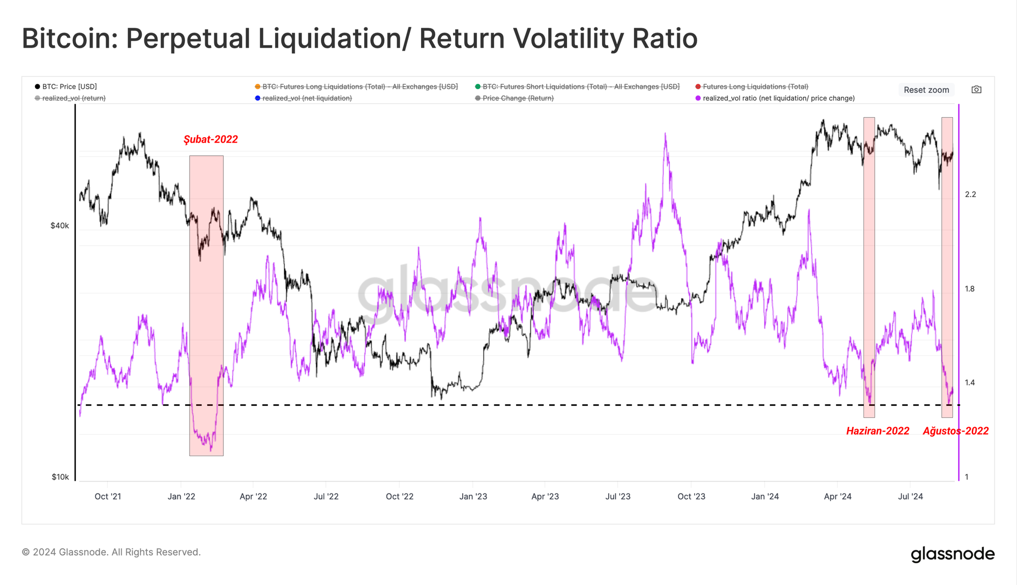 Fiyat ile net likidasyon hacmi volatilitesi arasındaki oranı inceleyerek, piyasanın kaldıraç iştahı hakkında bir başka göreceli okuma elde edebiliriz.
