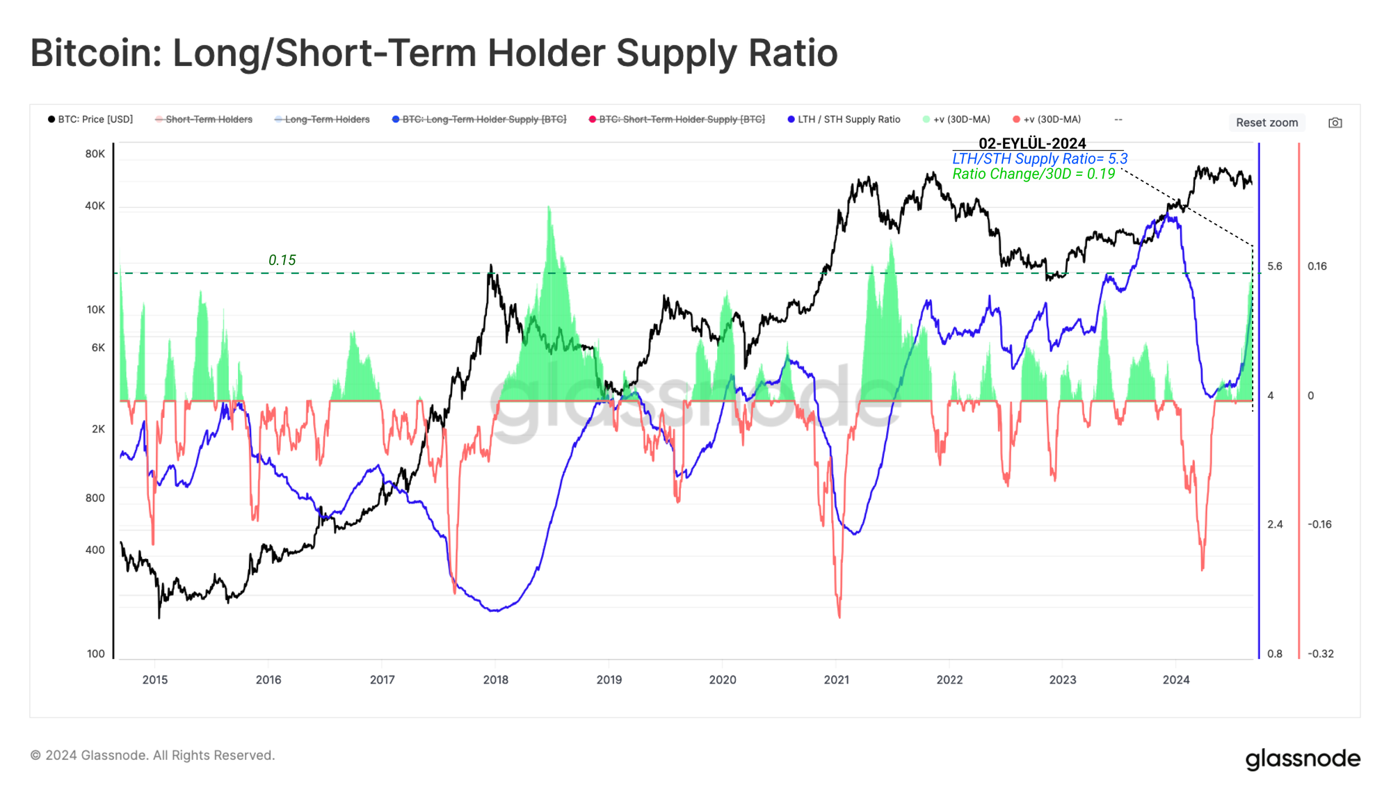 Son dönemde, LTH'lar kâr realizasyonlarını yavaşlattı ve ATH yükselişi sırasında biriken arz, kademeli olarak Uzun Vadeli Yatırımcı statüsüne geçiyor. Ancak, tarihsel olarak LTH arzının bu şekilde artması, genellikle bir ayı piyasasına geçiş sırasında meydana gelir.