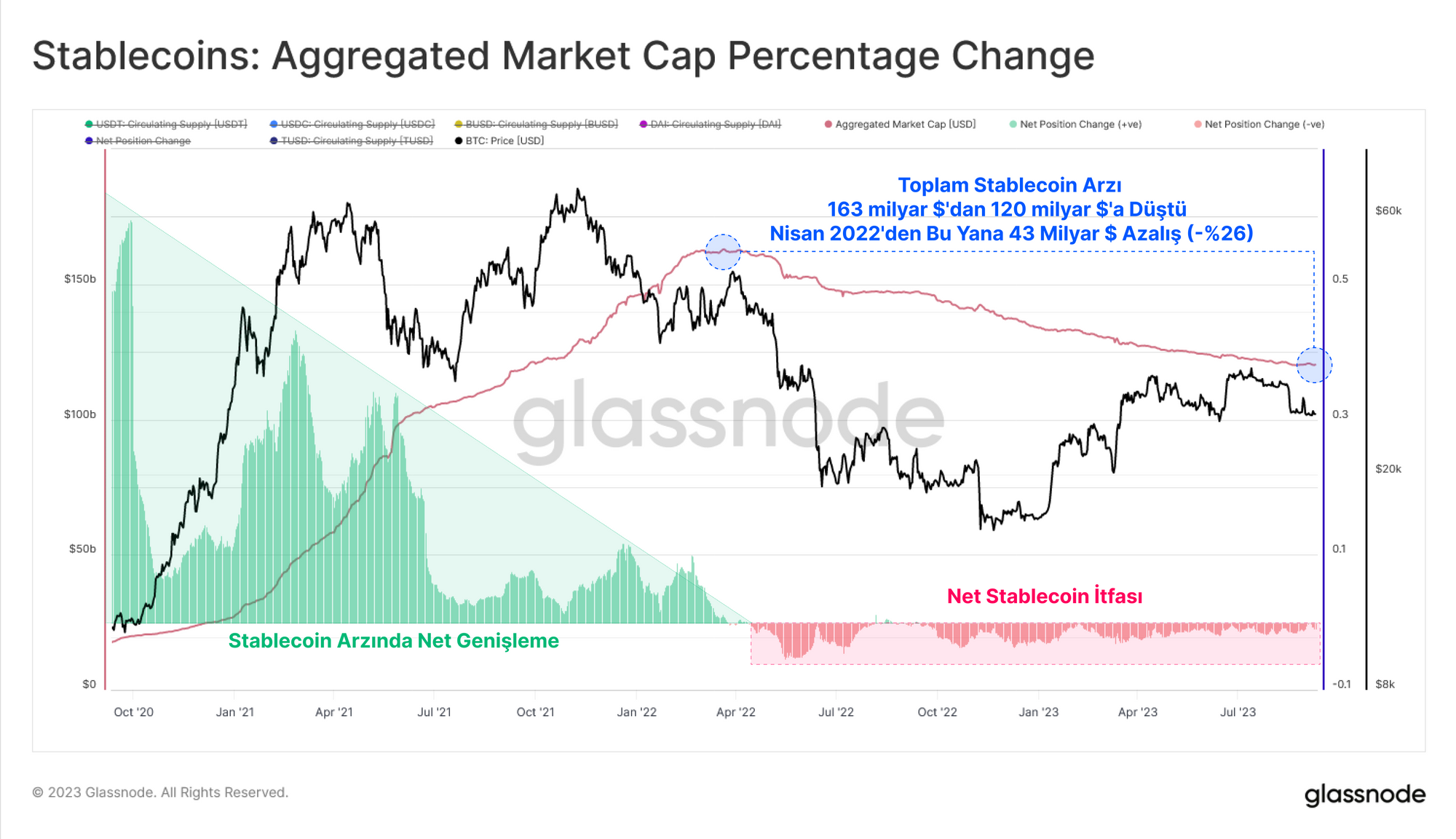 - Stablecoinler, Tether (USDT) hariç tüm büyük stablecoin varlıklarında itfalar yapıldıkça arzda sürekli bir düşüş yaşıyor.