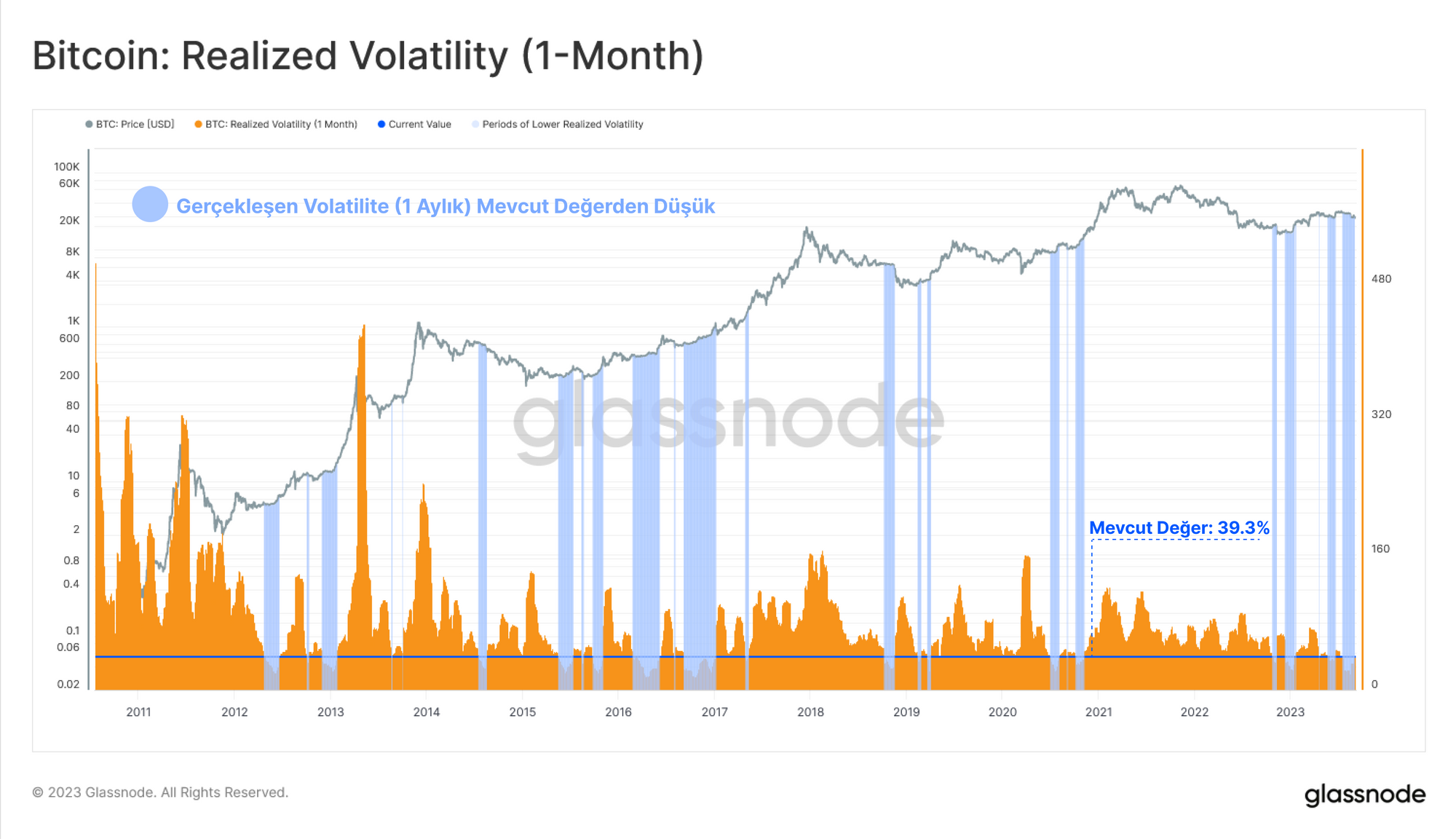 Yakın zamanda 26 bin $'a ulaşan satışlar sırasında ve daha sonra Grayscale'in SEC'e karşı mahkemelerde başarılı bir şekilde meydan okumasının ardından yaşanan volatilite artışına rağmen, Gerçekleşen Volatilite oldukça düşük kalmıştır. Piyasa halen tarihsel olarak düşük volatilite ortamındadır ve bu da genellikle ileride volatilitenin artacağının habercisidir.