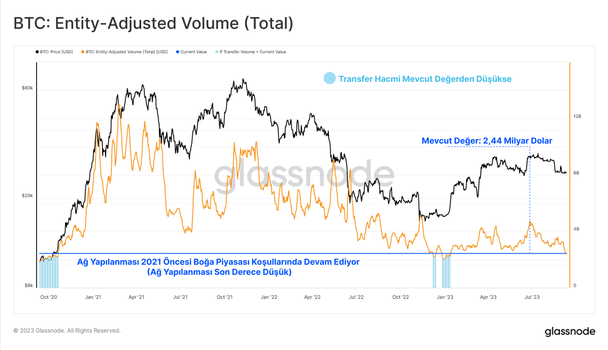 Bu düşük likidite ve düşük volatilite ortamı Bitcoin ağındaki takas hacimlerine de yansımaktadır. El değiştiren coinlerin toplam USD hacmi (entity-adjustment kümelememiz kullanılarak) günlük 2,44 milyar $ ile döngünün en düşük seviyelerinde seyrediyor ve Ekim 2020 seviyelerine geri döndü.