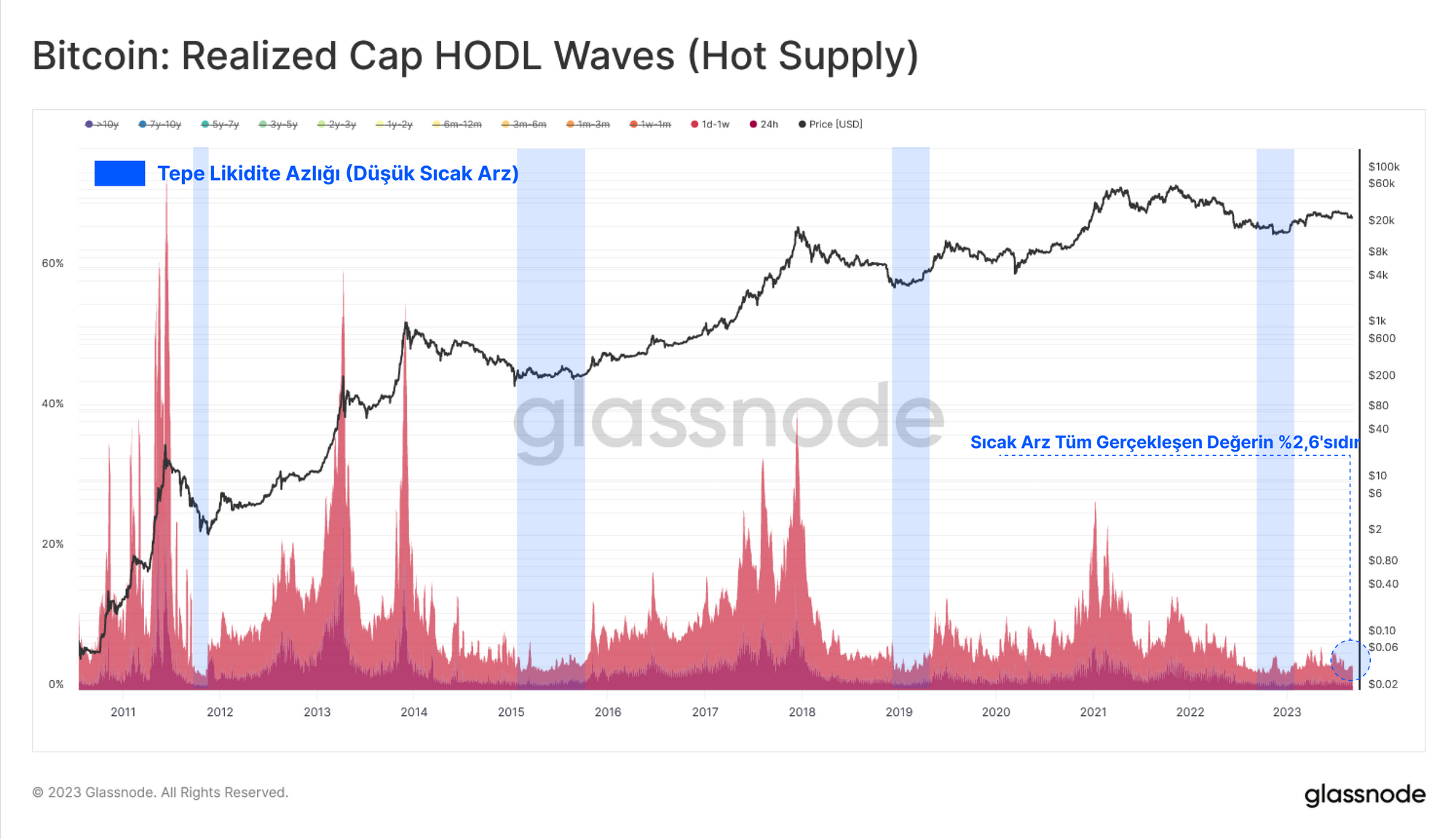 Bu 'Sıcak Arz' grubunda tutulan gerçekleşmiş değer tarihi düşük seviyelerde seyretmektedir ve bu da 1 haftadan daha eski olan çok az sayıda coinin şu anda işlem gördüğünü göstermektedir.