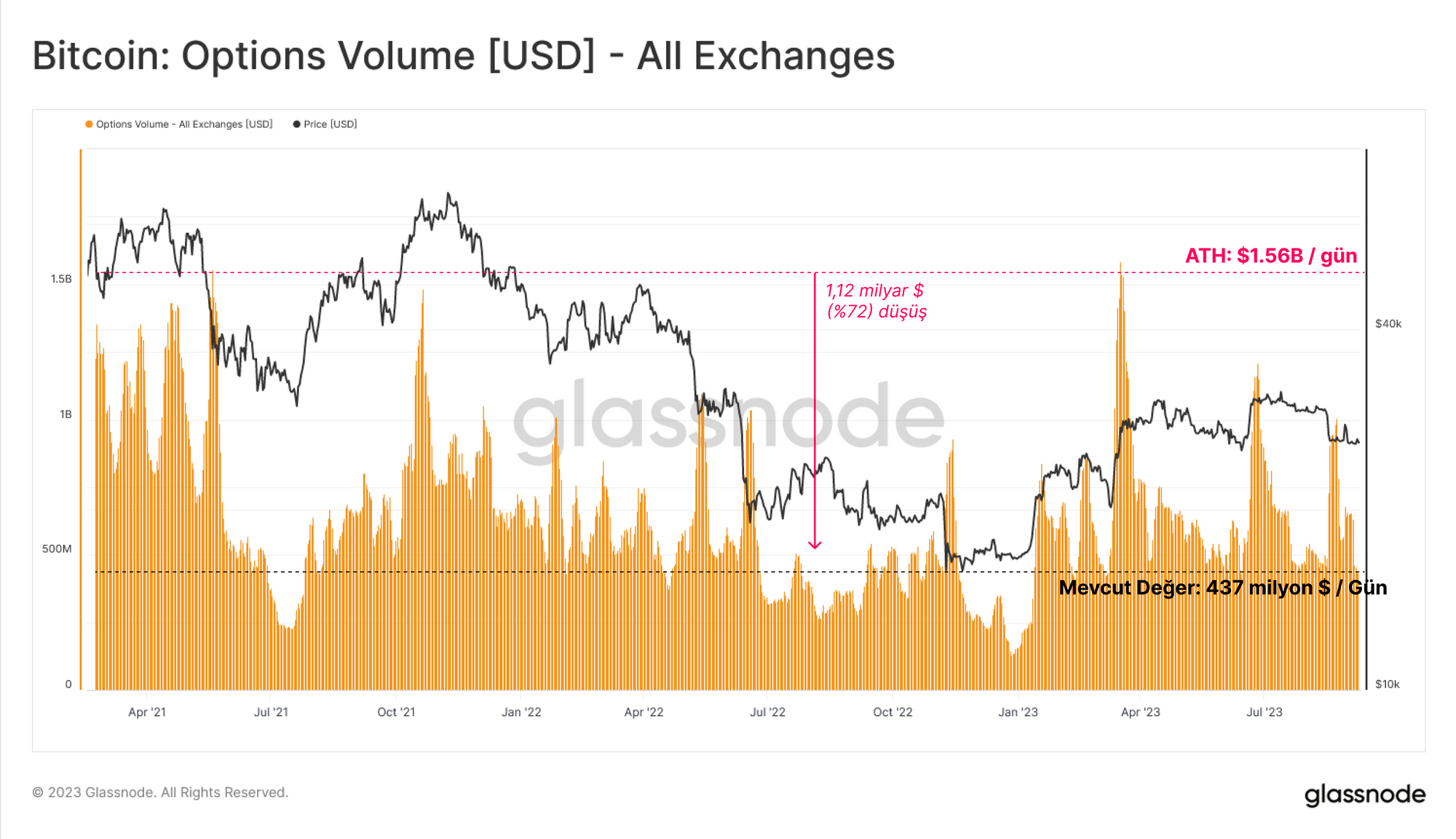 Bununla birlikte, Opsiyon piyasalarında ilginç bir farklılık fark ettik. 2023'te işlem hacimleri anlamlı bir şekilde arttı ve şu anda 437 milyon $/gün seviyesinde. Bu, piyasanın genel likidite koşullarının daha sıkı olduğu bir dönemde görüşlerini ifade etmek için opsiyonların kaldıraç ve sermaye verimliliğini kullanmayı tercih etmesinin bir yansıması olabilir.