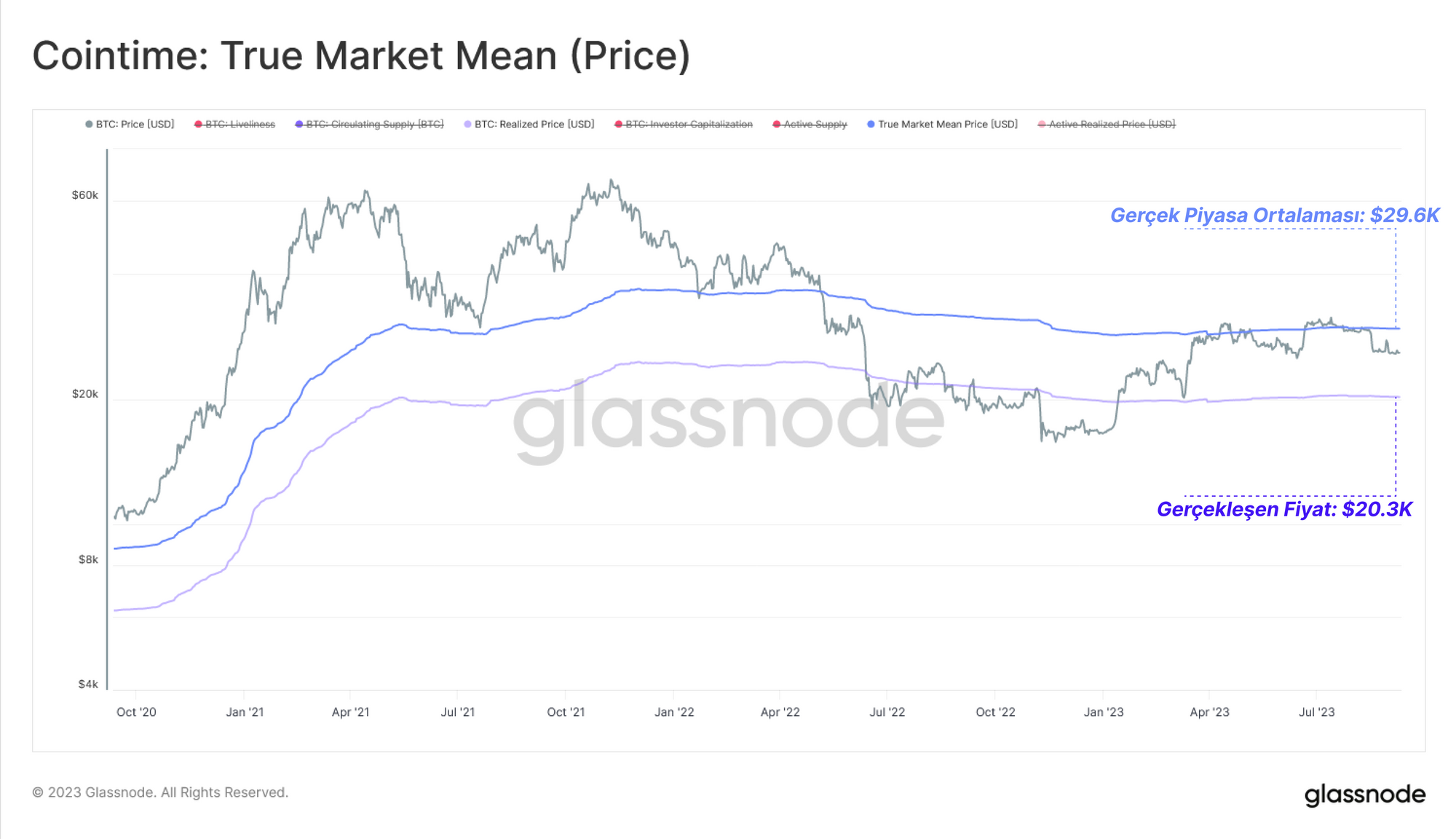 Bu çalışmadan elde edilen en önemli sonuçlardan biri, aktif Bitcoin yatırımcıları için en doğru 'maliyet temeli' modeli olduğunu savunduğumuz Gerçek Piyasa Ortalama fiyatının geliştirilmesiydi. Bu model şu anda 29,6 bin dolarda bulunuyor ve bu yılın Nisan ayından bu yana psikolojik bir direnç seviyesi oluşturdu. Geleneksel Gerçekleşen Fiyat ise 20,3 bin dolardan işlem görüyor ve her iki model de yıl içindeki fiyat hareketlerinin çoğunu sınırlıyor.