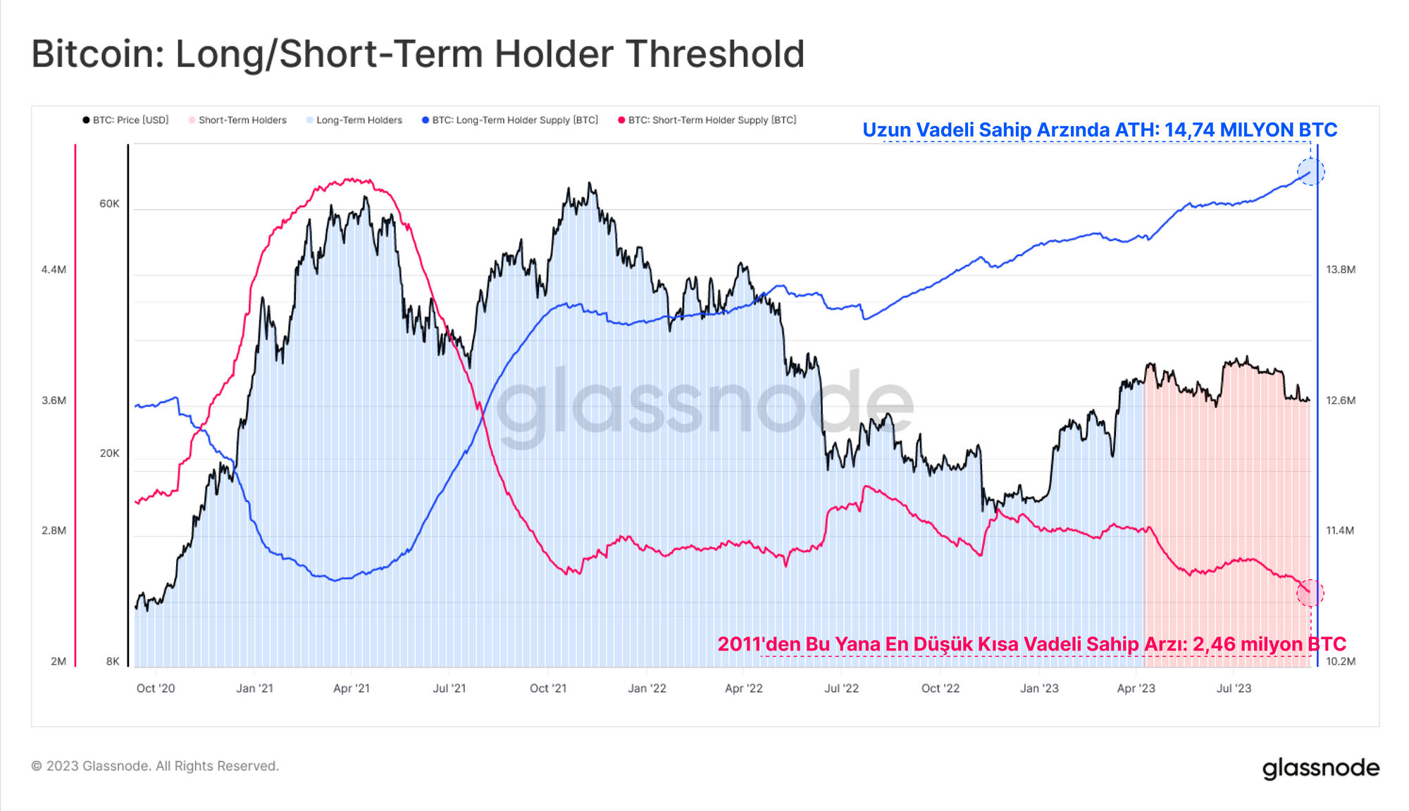 Hem zincir üstü hem de zincir dışı alanların son derece sessiz olması nedeniyle, Uzun Vadeli Sahipler grubunun elinde tuttuğu arzın 14,74 milyon BTC ile yeni bir ATH'ye ulaşması şaşırtıcı değildir. Buna karşılık, piyasanın daha aktif kısmını temsil eden Kısa Vadeli grupta tutulan arz, 2011'den bu yana tutulan en düşük arz seviyesine geriledi.