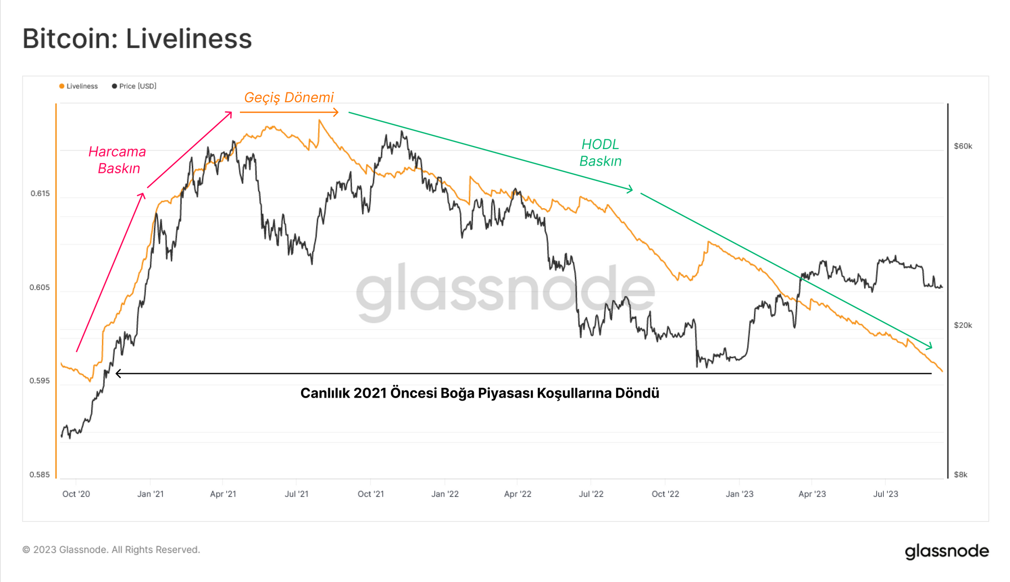 Canlılık şu anda 2020'nin sonlarındaki koşullara geri döndü ve giderek daha dik bir düşüş trendi görüyor. Bu durum, toplam 'yatırımcı elde tutma süresinin' arttığını ve yatırımcıların ellerindeki coinleri harcama ve elden çıkarma konusunda giderek daha isteksiz olduğunu göstermektedir.