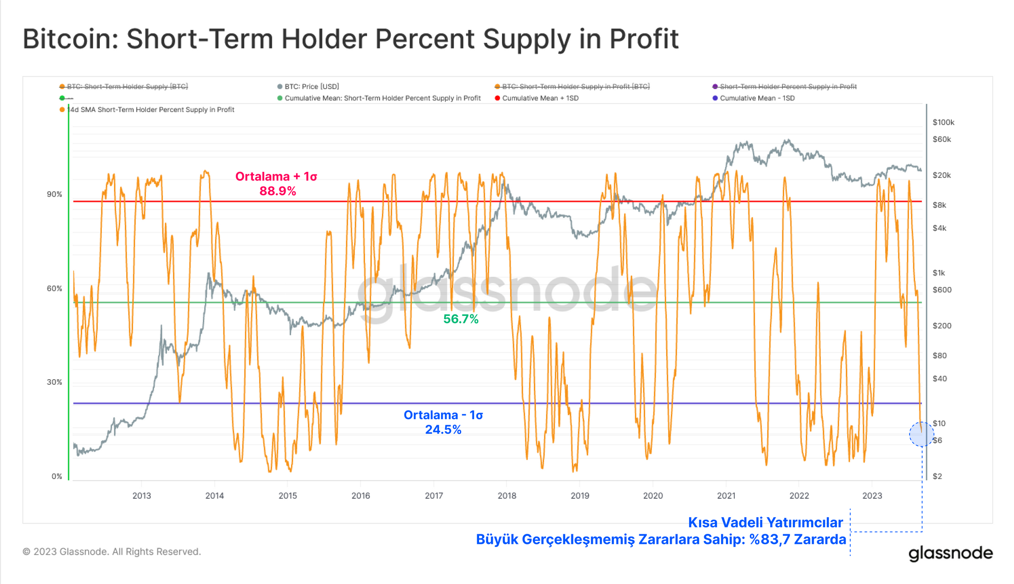 Aşağıdaki grafik Kısa Vadeli Yatırımcı arzının Kardaki yüzdesini göstermektedir. Arzlarının büyük çoğunluğunun gerçekleşmemiş bir zarara sürüklendiğini ve arzlarının yalnızca %16,3'ünün hala 'kârda' olduğunu görebiliyoruz.
