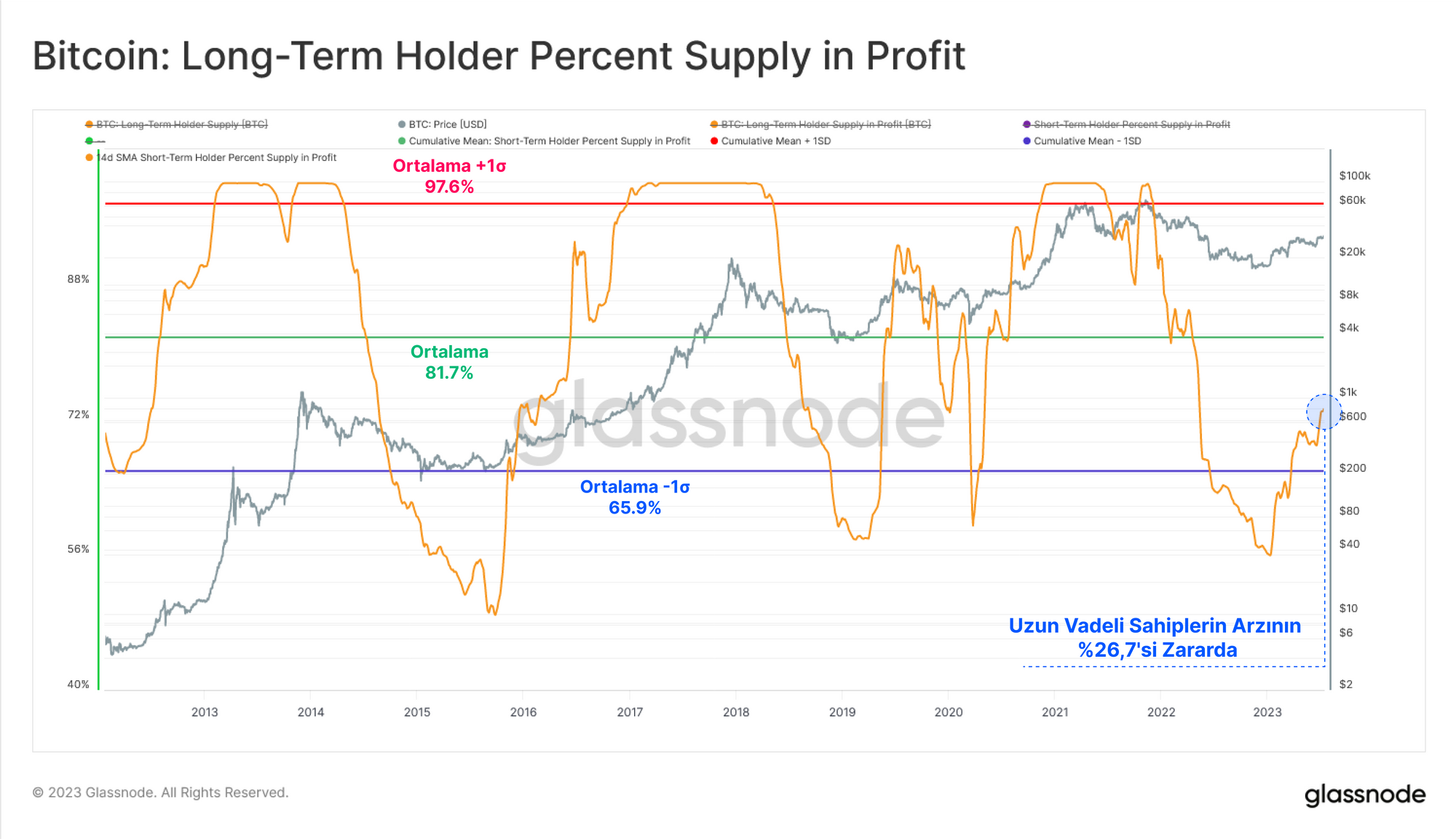 Uzun Vadeli Yatırımcılar grubunun karlılığı, tarihsel olarak hala düşük olmasına ve eksi bir standard sapma bandını ancak birkaç ay önce terk etmesine rağmen kademeli olarak artmaktadır. Bu yapıcı bir eğilim olmakla birlikte, LTH arzının %26,7'sinden fazlası satın alma fiyatlarına göre zararda ve tüm zamanların ortalamasının oldukça altında.