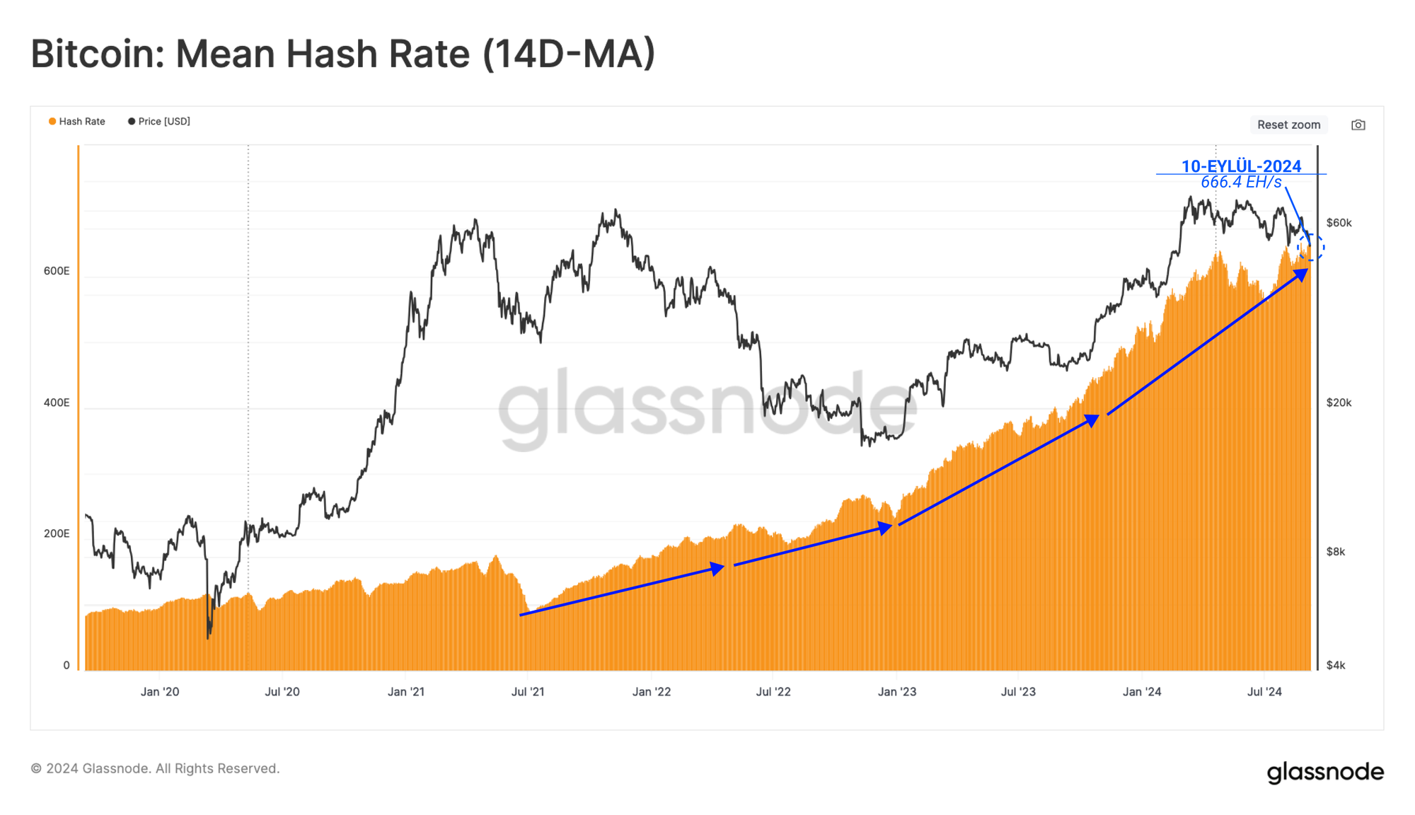 Dalgalı ve belirsiz piyasa koşullarına rağmen, Bitcoin madencileri yeni ASIC donanımları kurmaya devam etmiş ve toplam hash oranını yükseltmiştir. Hash oranı, 14 günlük hareketli ortalamaya göre 666.4EH/s'ye ulaşmış ve tüm zamanların en yüksek seviyesinin sadece %1 altında kalmıştır.