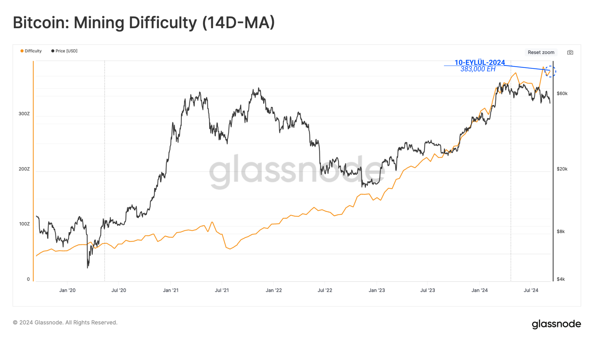 Şu anda, bir blok madenciliği yapmak için gereken ortalama hash sayısı 338k exahash'tir. Bu, Bitcoin'in yaşam süresi boyunca kaydedilen ikinci en yüksek zorluk seviyesi olup, madencilik endüstrisinin giderek artan rekabetçiliğini vurgulamaktadır.