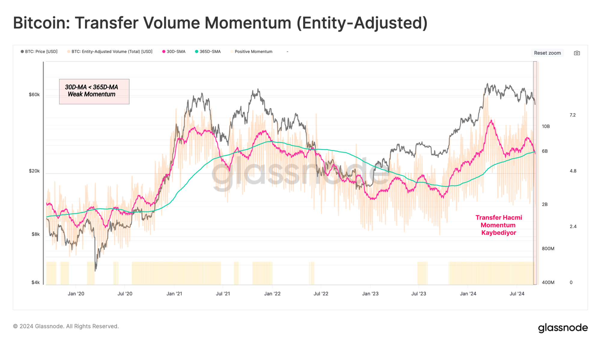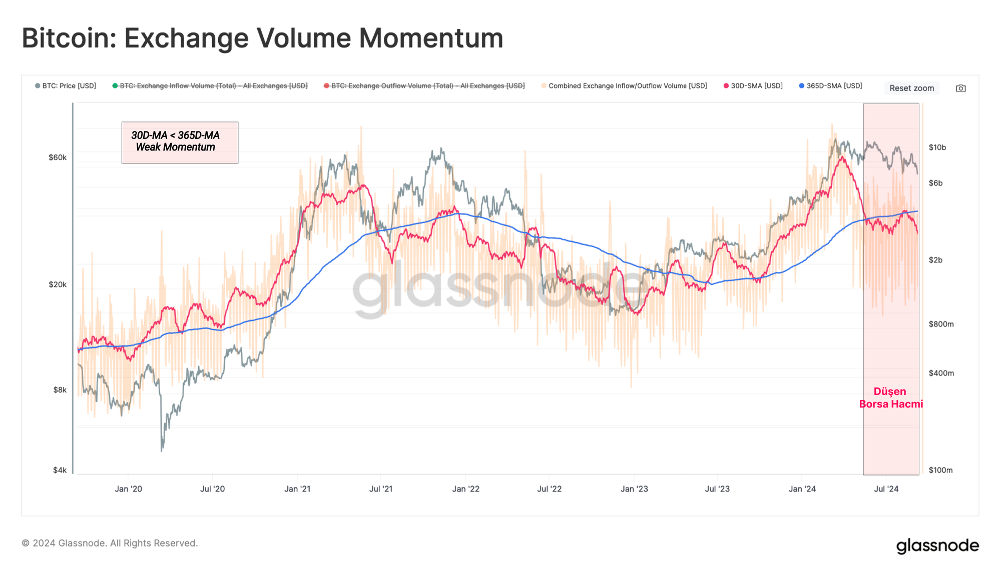 Borsalarla ilgili giriş ve çıkışlar için benzer şekilde 30 günlük/365 günlük momentum kesişimini incelediğimizde, aylık ortalama hacmin yıllık ortalamanın oldukça altında kaldığını görebiliriz. Bu durum, yatırımcı talebinde ve spekülatörlerin mevcut fiyat aralığında yaptığı ticarette bir düşüş olduğunu vurguluyor. Bu azalan ticaret hacmi, yatırımcıların mevcut fiyat seviyelerine olan ilgisinin azaldığını ve spekülasyon iştahının zayıfladığını gösteriyor.