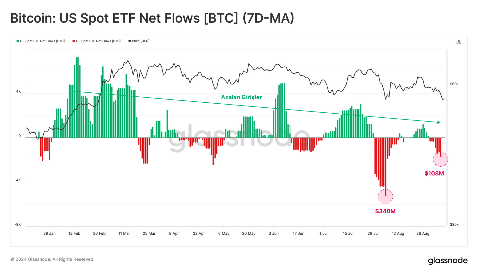 Bitcoin ETF'lerine baktığımızda, Ağustos 2024'ten bu yana net sermaye akışlarının yavaşladığını görüyoruz ve şu anda haftalık 107 milyon $'lık bir çıkış rapor ediliyor. Bu sermaye çıkışları, yatırımcı ilgisinde bir duraklama olduğunu ve ETF'ler aracılığıyla kripto varlıklarına olan talebin azaldığını gösteriyor.