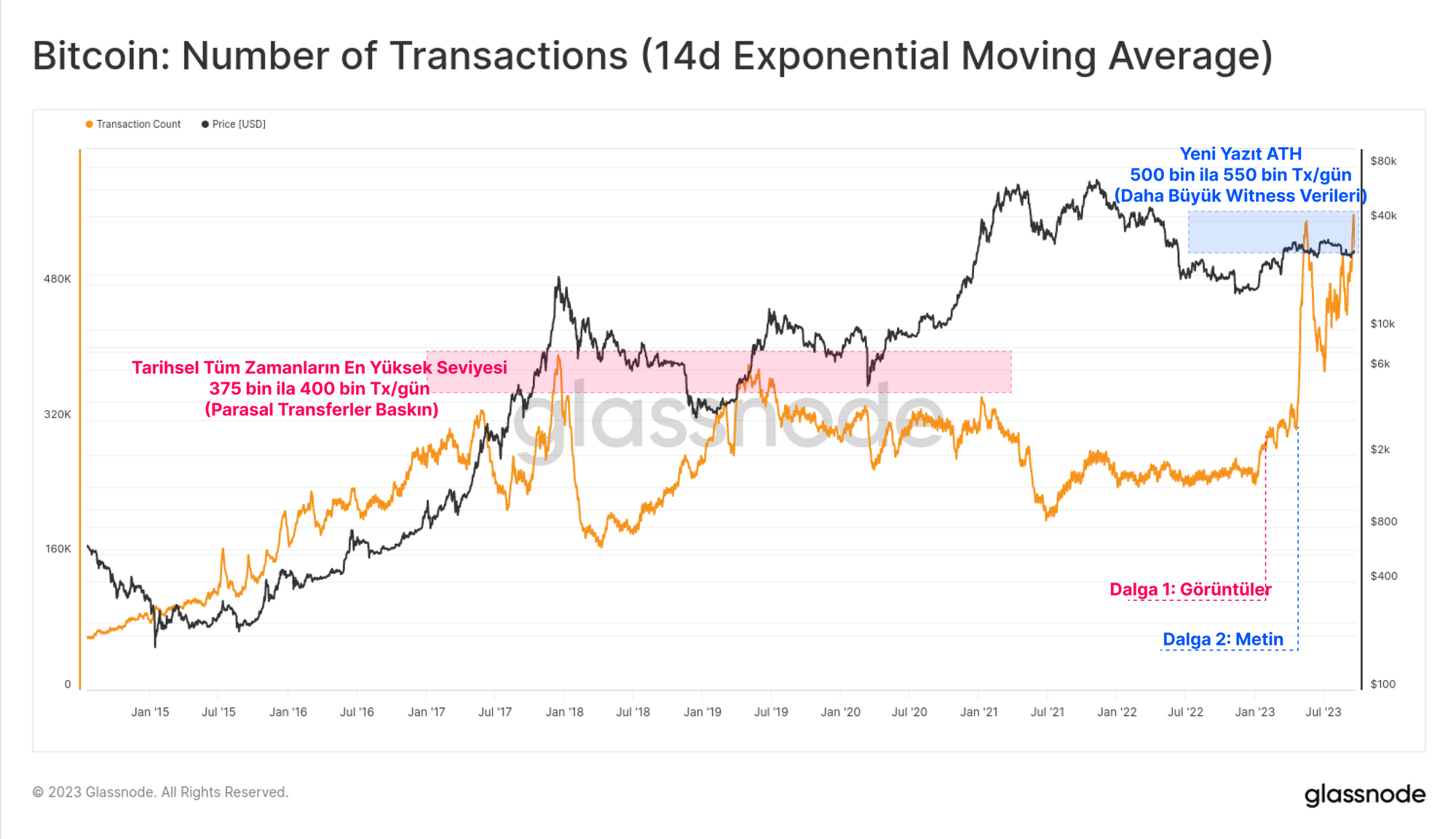 Yazıtlar, Bitcoin kullanıcılarının dosyaları işlem veri yapısının tanık kısmına kodlamasına olanak tanır. Aşağıdaki grafik şu ana kadar iki yazıt dalgası olduğunu göstermektedir:
