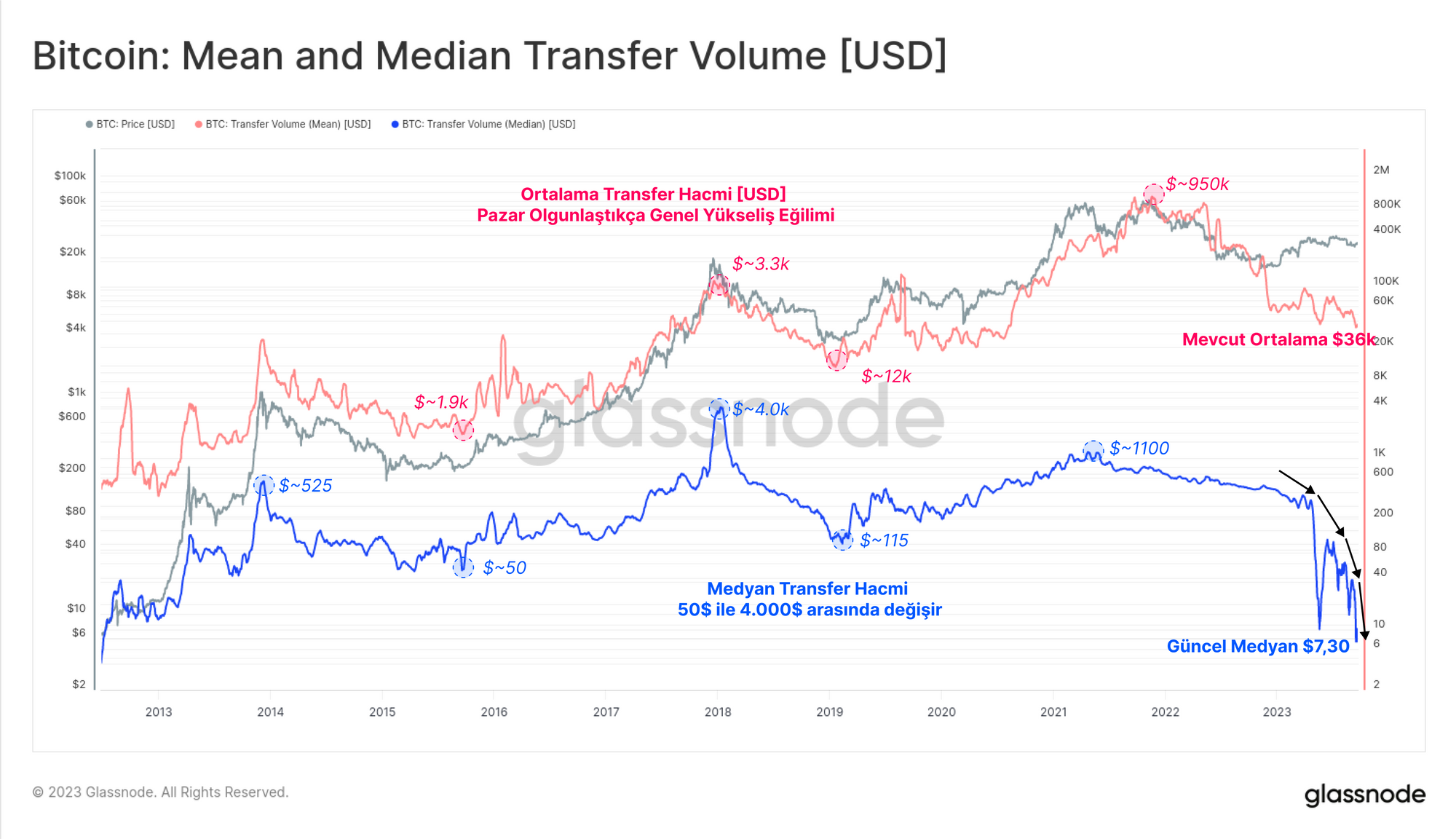 - 🔵 Medyan Transfer Hacimleri daha küçük yatırımcıları (tarihsel olarak) ve daha yakın zamanlarda yazıtları (2023'te) daha fazla temsil etmektedir.