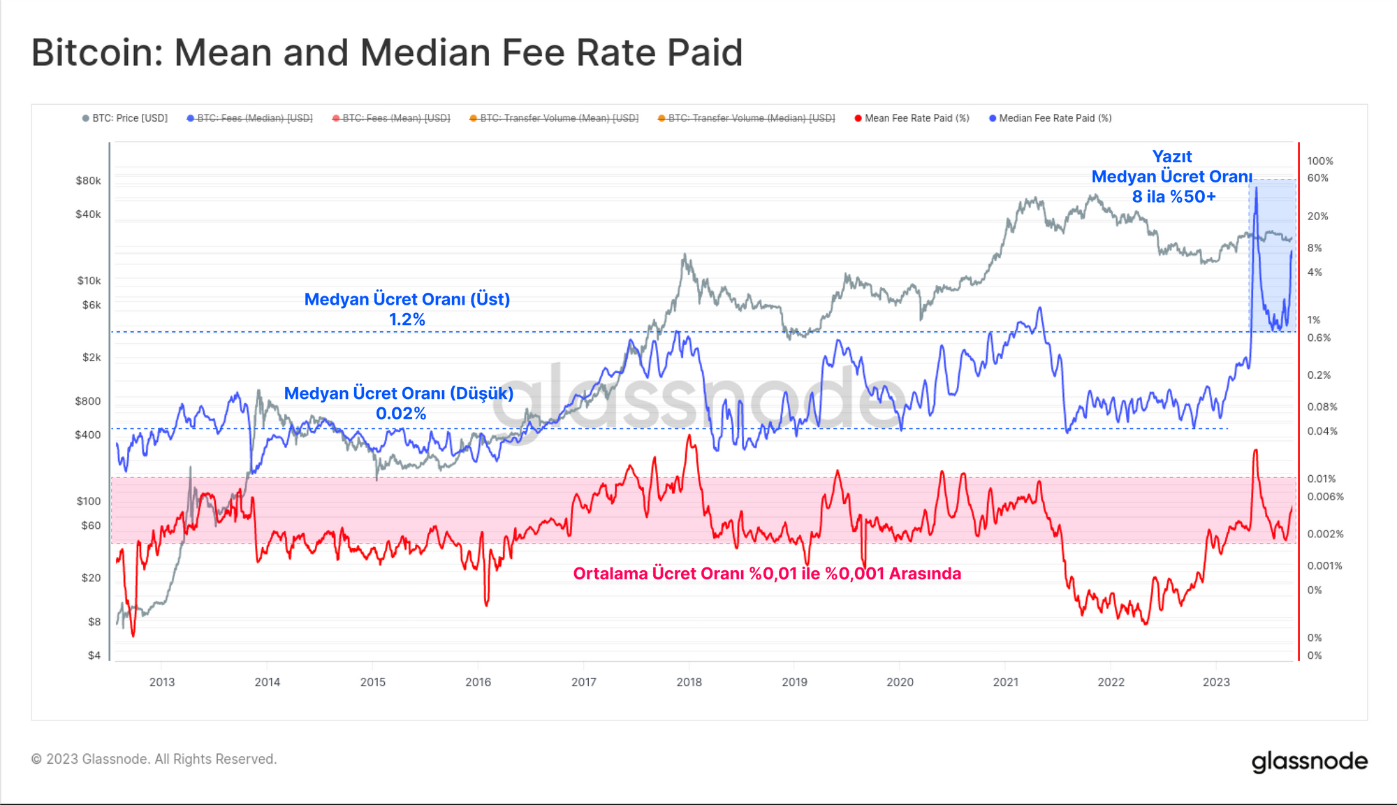 Ancak Medyan ücret oranları için, yüksek aciliyetli işlemlerin, piyasa coşku durumuna girdiğinden, boğa piyasasının zirveleri sırasında %1,2'ye kadar ücret ödemeye istekli olduğunu görüyoruz. 2023'te bu durumun, %10'a varan ve hatta transfer edilen değerin %50'sinden fazlasını aşan ücretlerin giderek yaygınlaştığı yazıtlara da yansıdığını gördük.