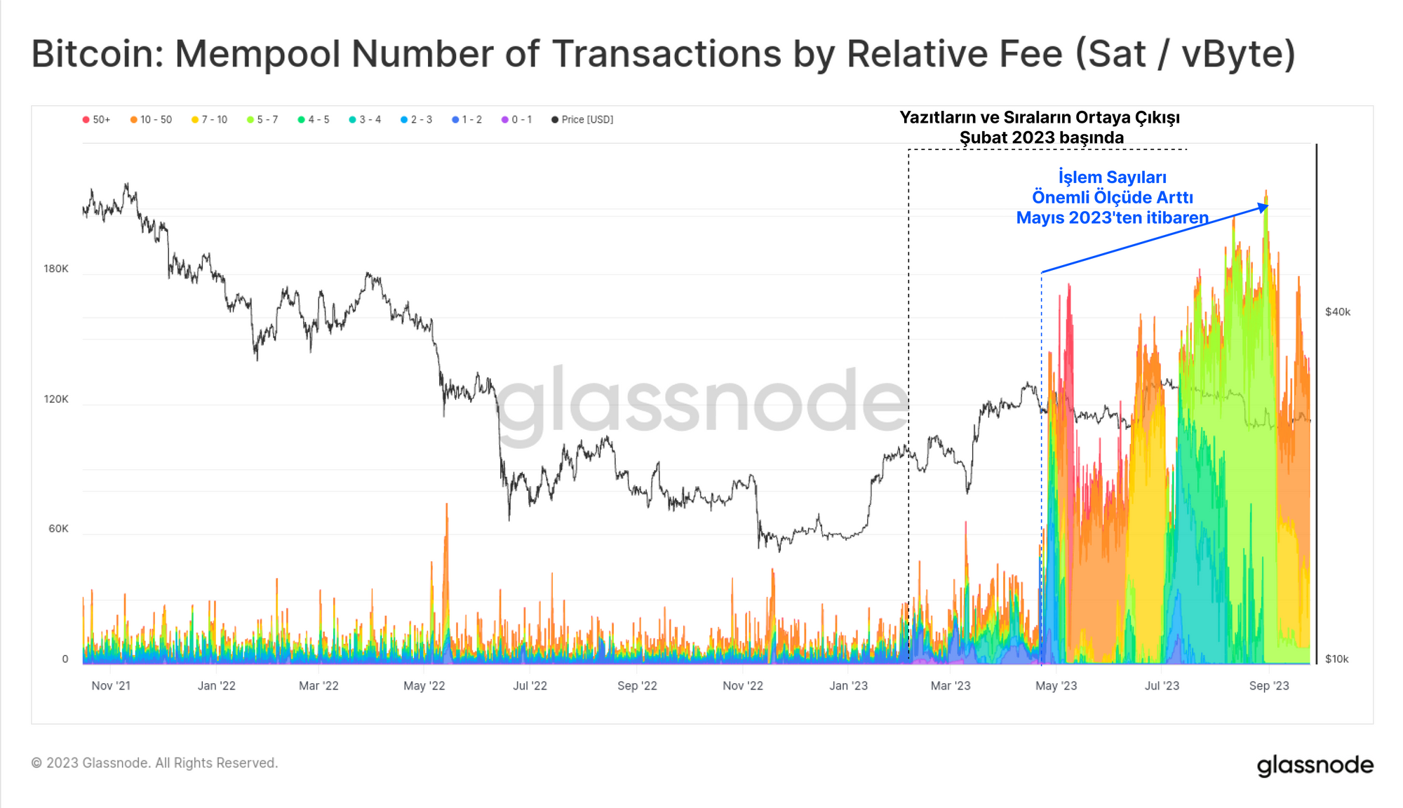 Metin tabanlı yazıtların patlaması, mempool'umuzdaki bekleyen işlemlerdeki artışla açıkça uyumludur. Bu, küçük boyutlu metin yazıtlarının blok alanı için önemli bir talep kaynağı haline geldiğini doğrulamaktadır.