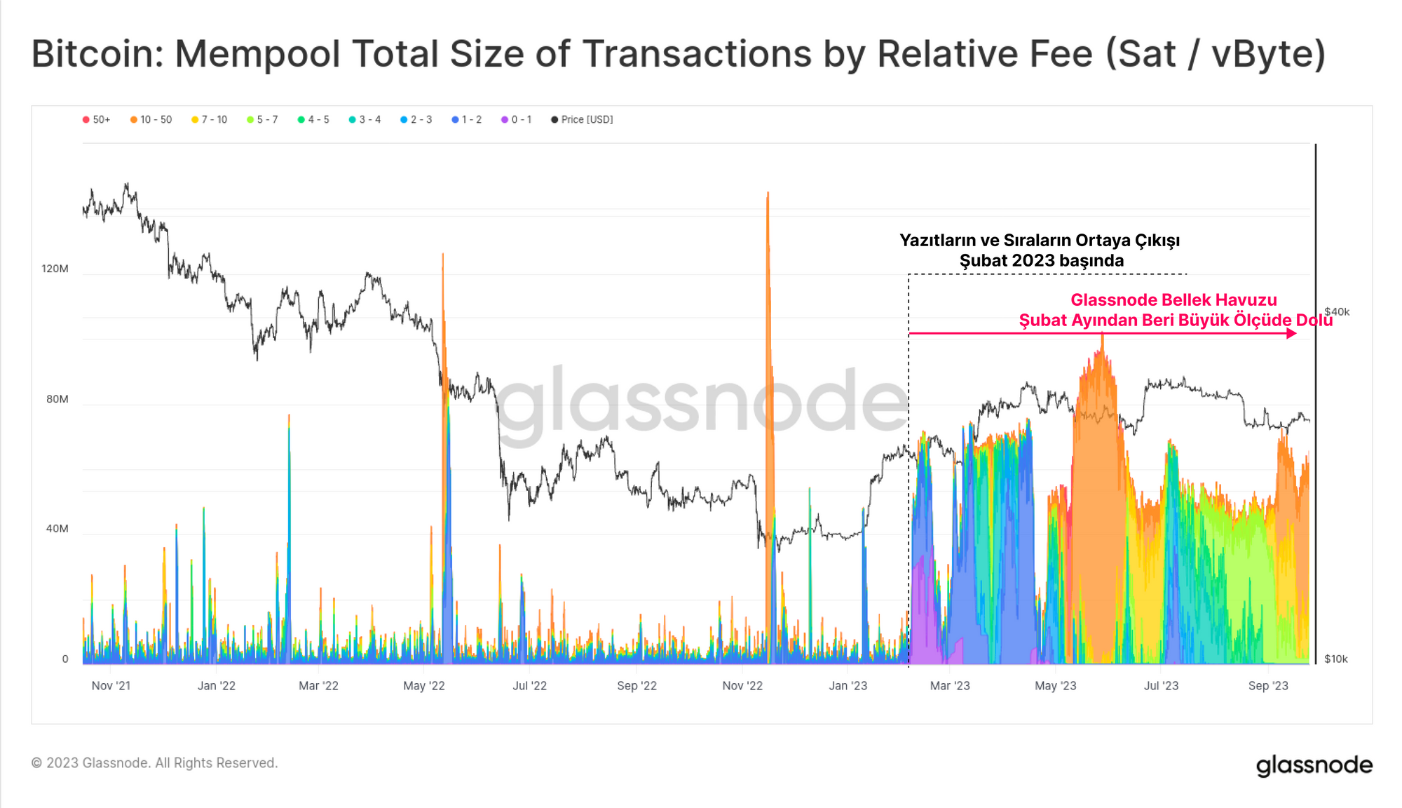Aşağıdaki grafik, Glassnode bellek havuzunda geçen yıl boyunca en yüksek ücret ödeyen işlemlerin veri boyutunu göstermektedir. Blok alanı talebinde Şubat ayında başlayan ve Sıralar ve Yazıtların yayınlanmasıyla aynı hizaya gelen önemli artış dikkat çekicidir. Bu yüksek talep o zamandan beri devam etmektedir.