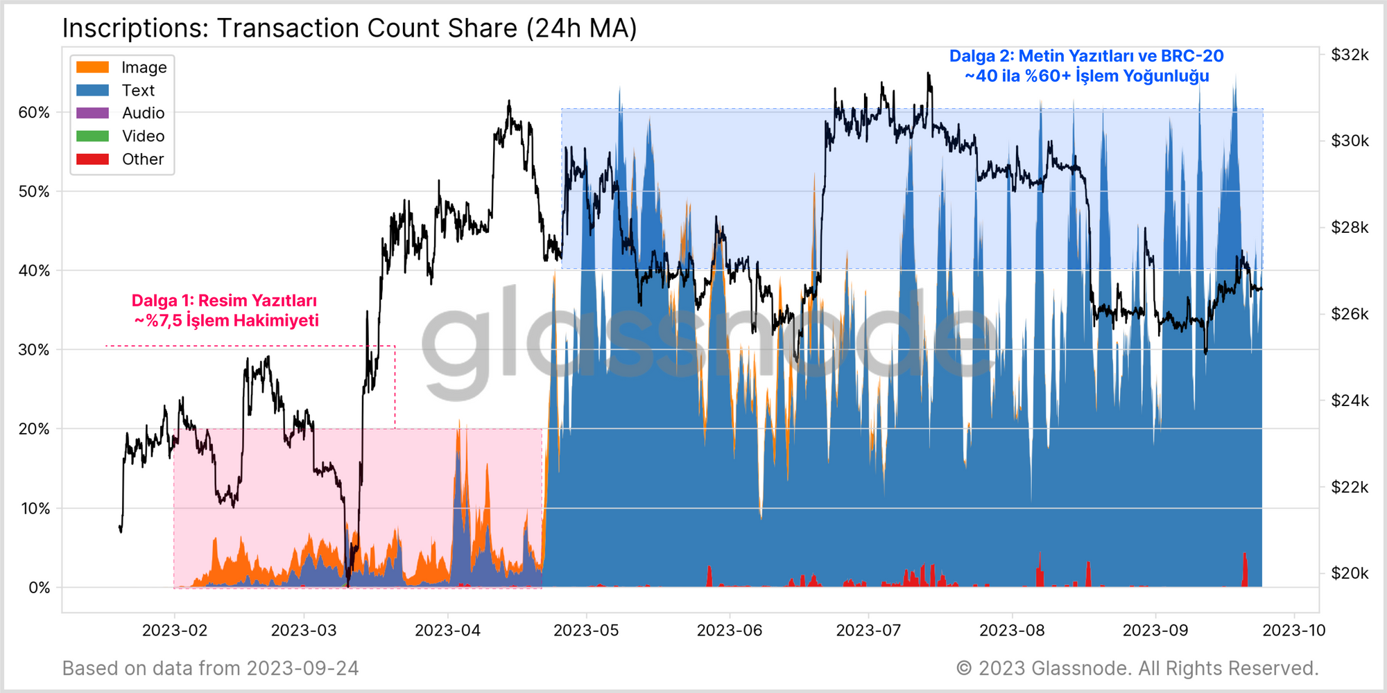 Mayıs ayından bu yana gerçekleşen tüm işlemlerin %40'ı ile %60'ı arasında değişen bir oranını metin tabanlı yazıtlar oluşturuyor. Bu, tüm işlemlerin yalnızca %7,5'ini temsil eden görüntü ağırlıklı yazıtların ilk dalgasını gölgede bırakmaktadır.