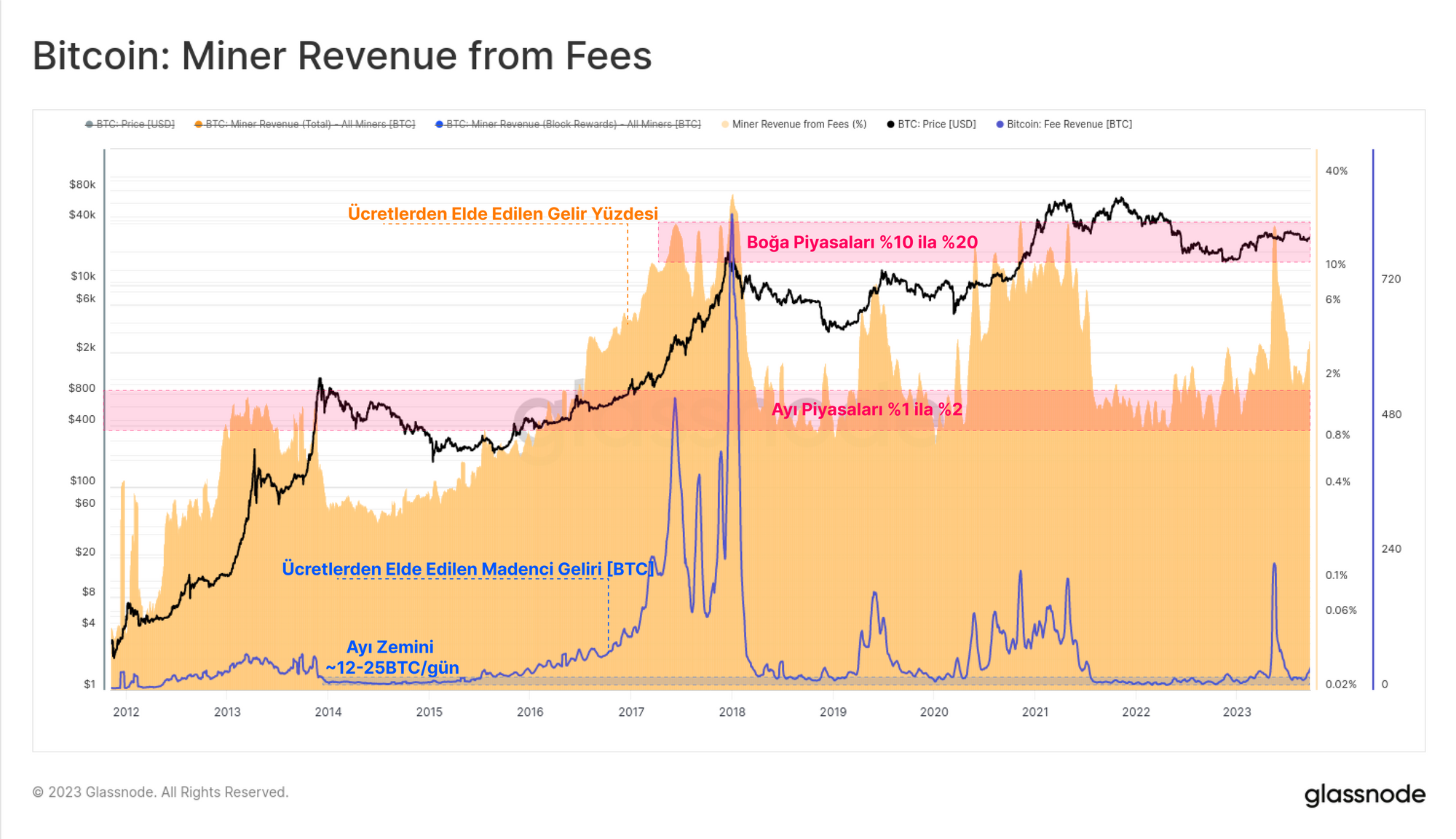 Her iki ölçüt de tipik 'ayı piyasası' seviyelerinin üzerine çıkmıştır; toplam ücretler ~12 BTC/gün'den 38 BTC/gün'e %216 oranında artmış ve madencinin ücretlerden elde ettiği gelirin oranı %1'den %4'e yükselmiştir. Her ikisi de anlamlı artışlardır, ancak mutlak ve tarihsel bağlamda hala küçüktür.
