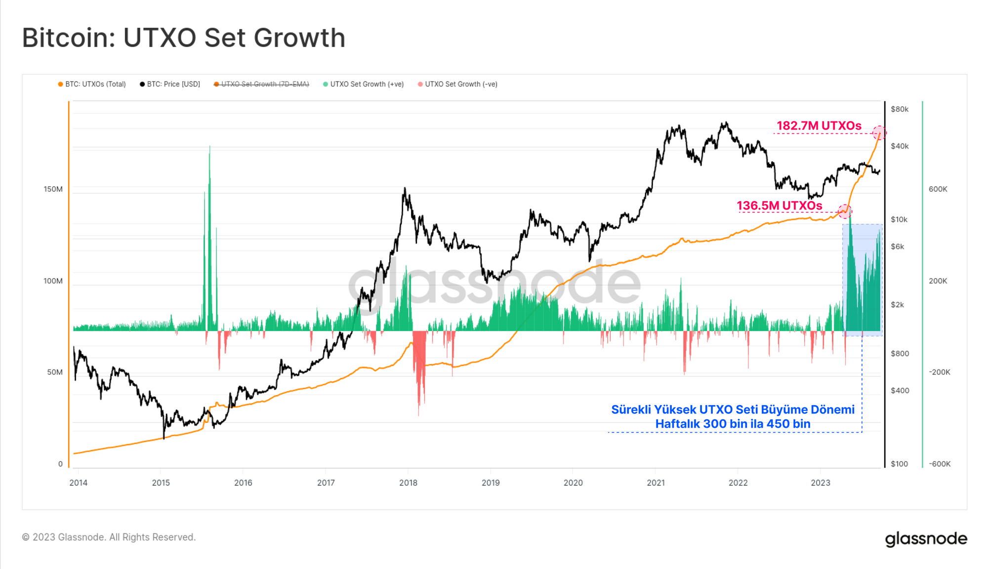 Yazıtların dikkate değer bir etkisi de hızla genişleyen UTXO setidir. Şubat ayından bu yana setteki toplam UTXO sayısı +46,2 milyon (+%33,8) artmıştır. Bu, tarihteki en büyük haftalık artış oranıdır ve altı ay boyunca 300 bin ila 450 bin UTXO/wk arasındaki seviyeleri sürdürmüştür.