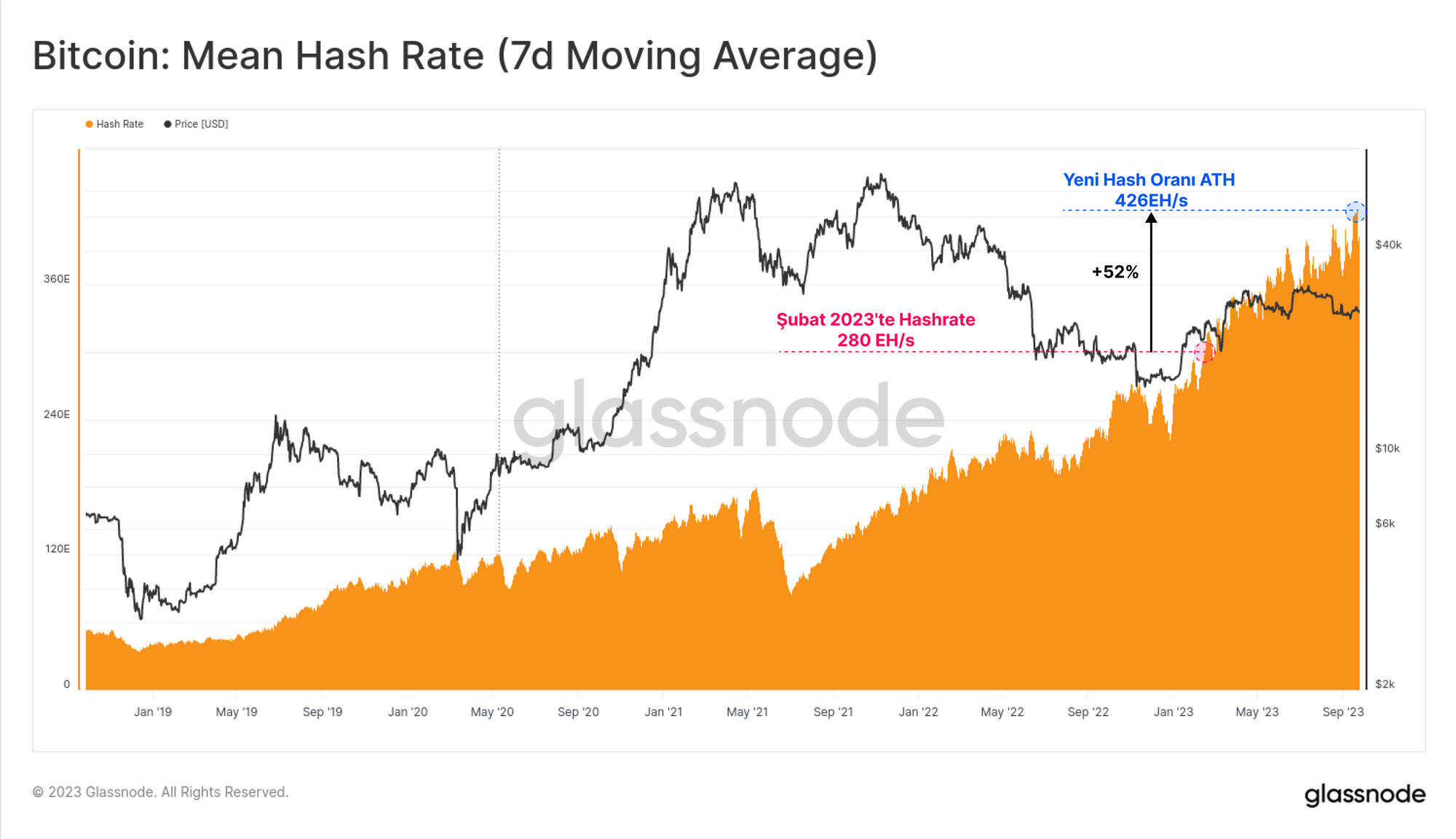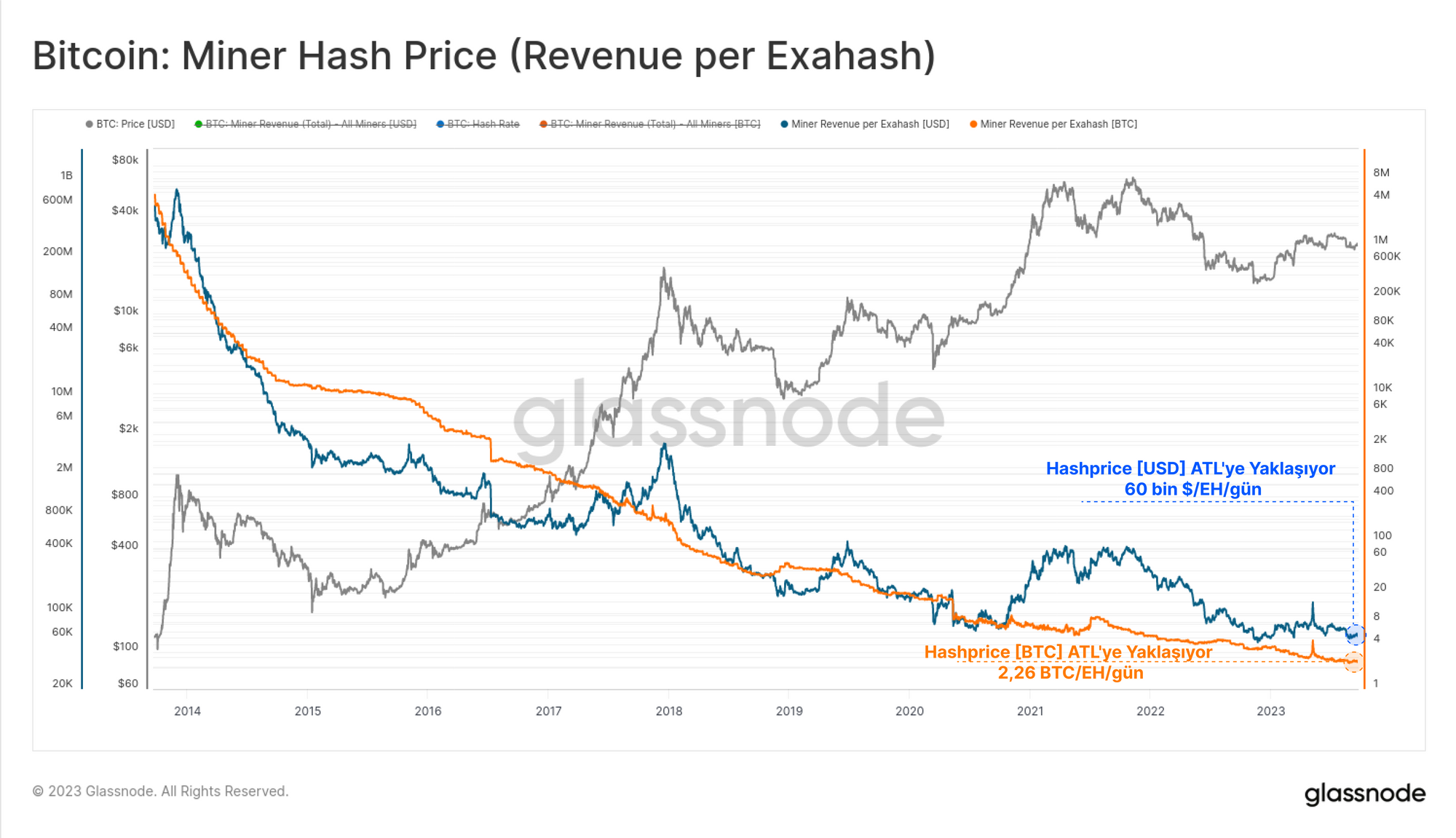 Bu durum, Exahash başına kazanılan BTC veya USD ödülü olan hash fiyatını tüm zamanların en düşük seviyesine çekti. Madenciler artık ağda aktif olan Exahash başına sadece 2,26 BTC (~60 bin $) kazanacak.