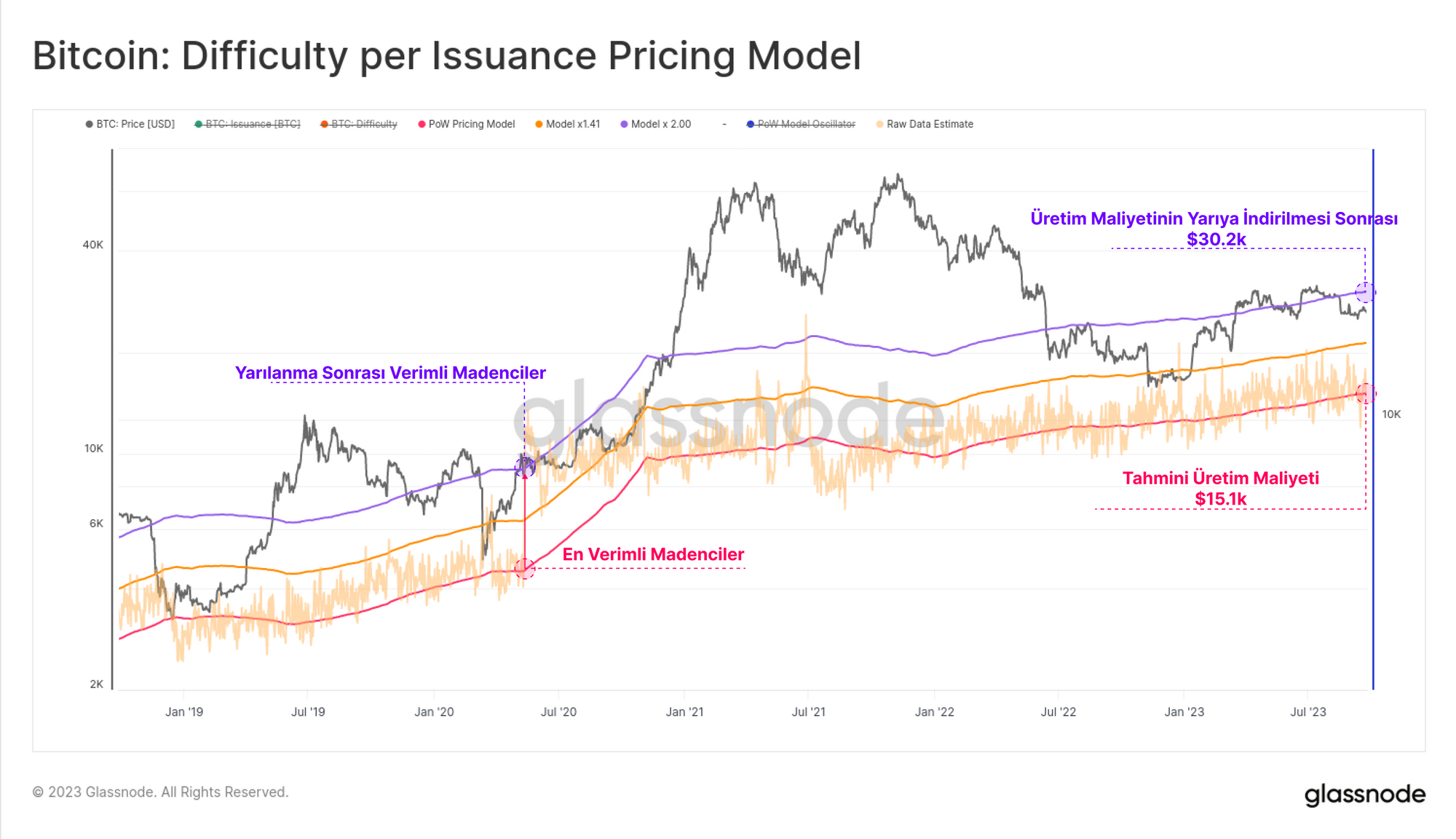 BTC üretim maliyetini tahmin etmeye yönelik bir başka yaklaşım da zorluğa göre göreceli ihraç yöntemidir. Bu modelle, ağdaki en verimli madencilerin yaklaşık 15,1 bin dolarlık bir satın alma fiyatına sahip olduğunu tahmin ediyoruz.