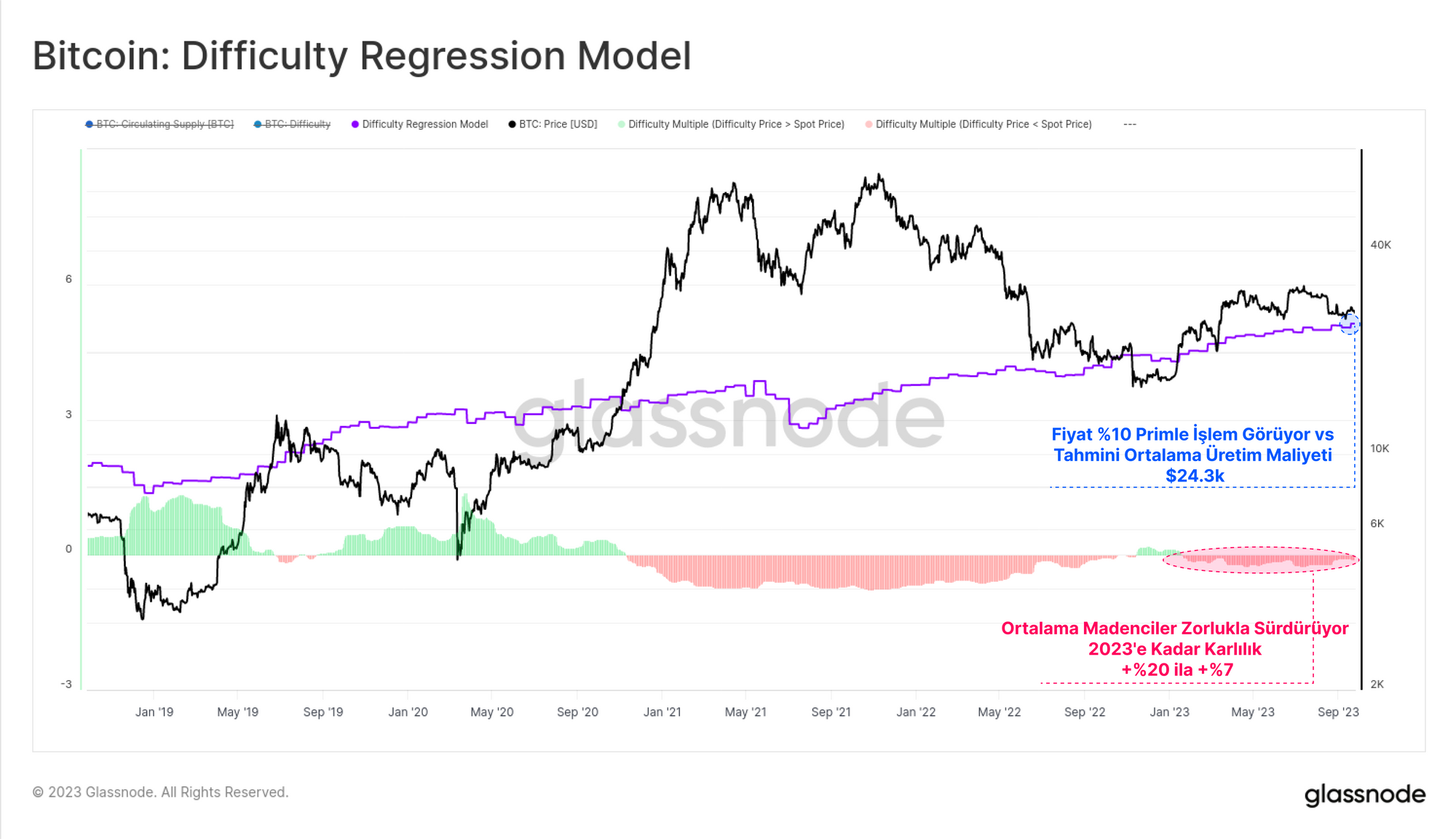 Daha önceki bir çalışmada, Piyasa Değeri ve zorluk arasındaki bir regresyon modeli aracılığıyla BTC için ortalama tüm üretim maliyetini tahmin etmeye çalışmıştık. Bu modele göre, ortalama madenci edinim fiyatı 24,3 bin $ civarındadır ve bu da mevcut spot fiyata göre %10'dan daha az bir primdir.