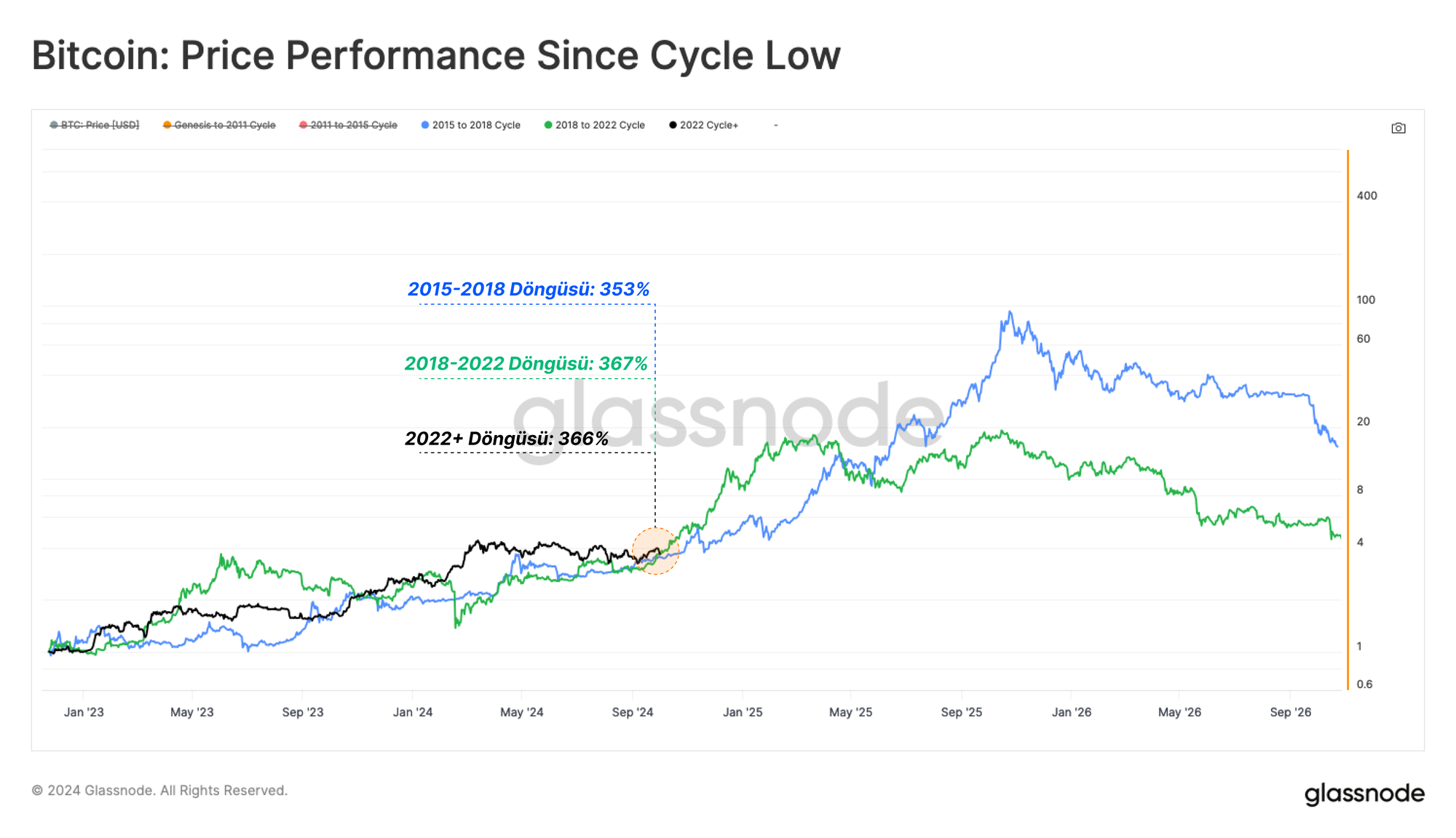 Bu dönemlerin benzer fiyat yapıları, Bitcoin'in döngüsel doğasını ve önceki piyasa toparlanmalarıyla paralellik taşıyan bir iyileşme sürecinde olduğunu işaret ediyor. Bu benzerlikler, piyasa yapısını ve yatırımcı davranışını analiz etmek için güçlü bir temel sunuyor ve döngülerin doğasının sürekliliğini vurguluyor.