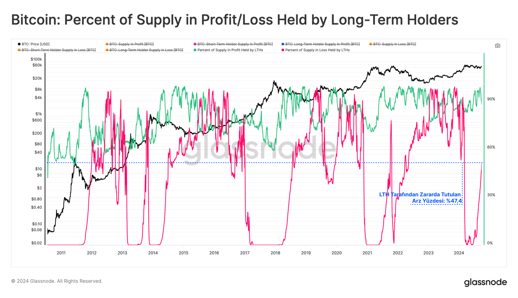 Eğer Uzun Vadeli Yatırımcılar tarafından zararda tutulan toplam arzın oranını inceleyecek olursak, bu grubun baskınlığında önemli bir artış görüyoruz. Bu grup, şu anda zararda olan tüm coinlerin %47.4'ünü elinde tutuyor.