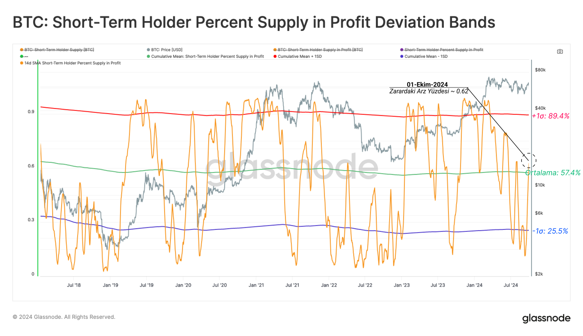 Kısa Vadeli Yatırımcıların (STH) Kârda Tuttukları Arz Yüzdesi de benzer bir tabloyu yansıtıyor. Şu anda bu yatırımcıların %62'sinden fazlası kârlı durumda coin tutuyor. Bu veriden iki önemli çıkarım yapılabilir:
