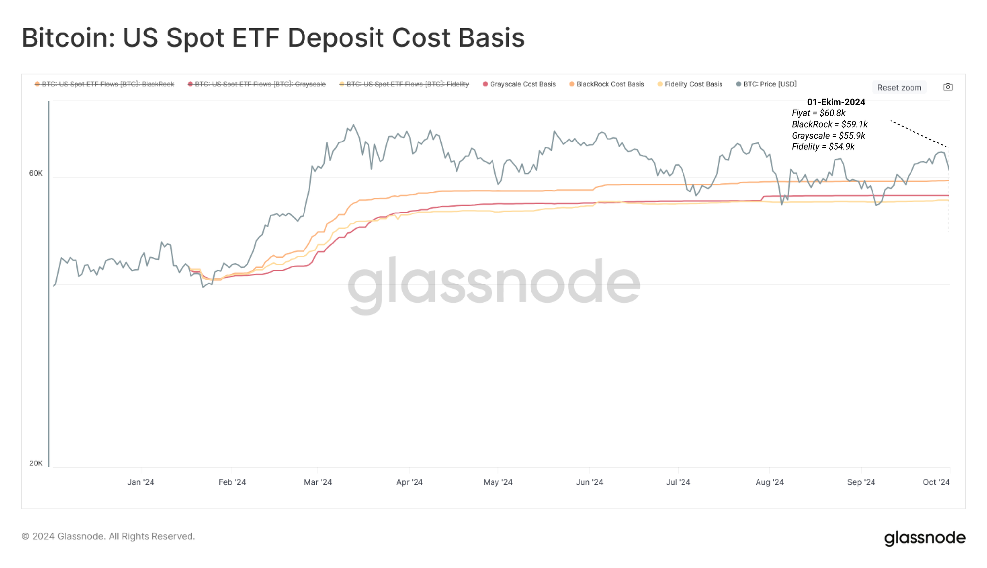 BlackRock, Fidelity ve Grayscale, ABD'deki en büyük Spot Bitcoin ETF'leri arasında yer alıyor. Bitcoin mevduatlarının bu ETF'lere yapıldığı fiyatları inceleyerek, ortalama satın alma maliyet esasını tahmin edebiliriz. Bu ETF'lerin maliyet esası $54.9k ile $59.1k arasında değişiyor.