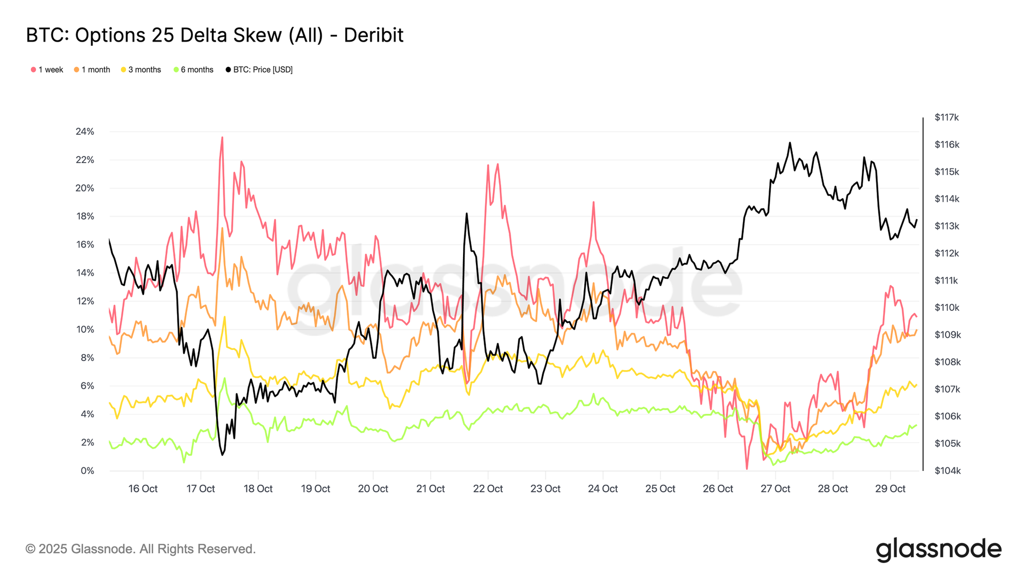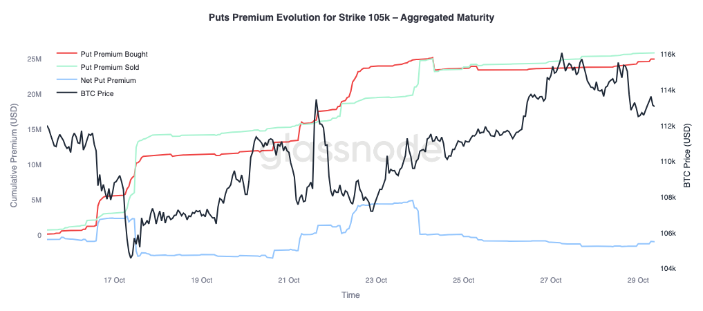 Tablonun tamamlanması için piyasanın put tarafına dönebiliriz. 24 Ekim'den bu yana, Bitcoin yükselişe geçerken yatırımcılar 110K USD'lik putları alarak kısa vadeli düşüş korumasına talep olduğunu gösterdi. Öte yandan, 105K USD'lik putlar daha aktif bir şekilde satıldı; bu da katılımcıların daha derin baz fiyatlardan sigorta sağlayarak prim toplamaktan memnun olduğuna işaret ediyor.