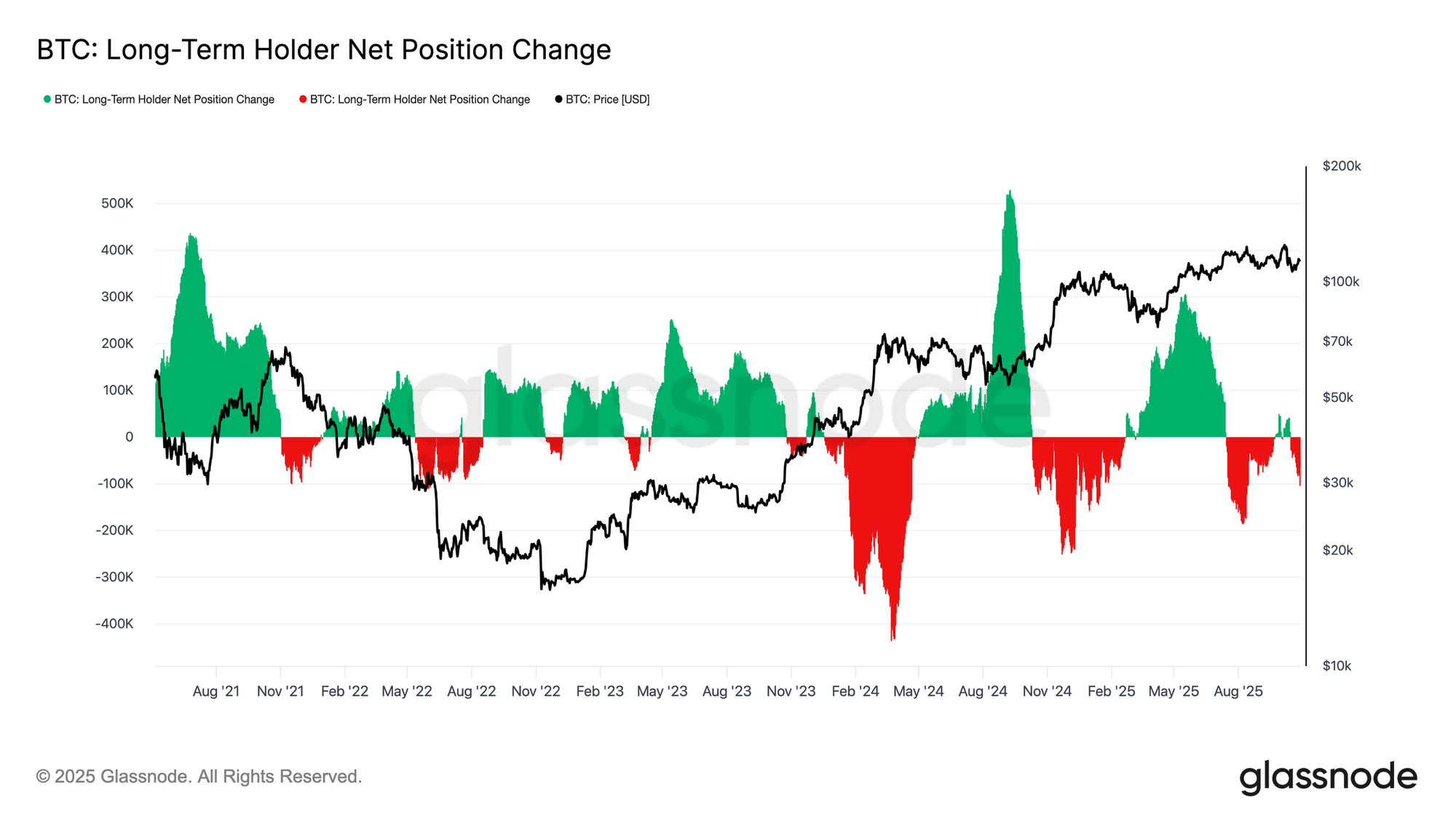 Önceki gözlemlere dayanarak, uzun vadeli yatırımcıların süregelen satışları piyasa yapısı üzerindeki baskıyı sürdürüyor. Uzun Vadeli Yatırımcı Net Pozisyon Değişimi aylık -104K BTC'ye gerileyerek Temmuz ortasından bu yana görülen en belirgin dağılım dalgasını işaret ediyor.