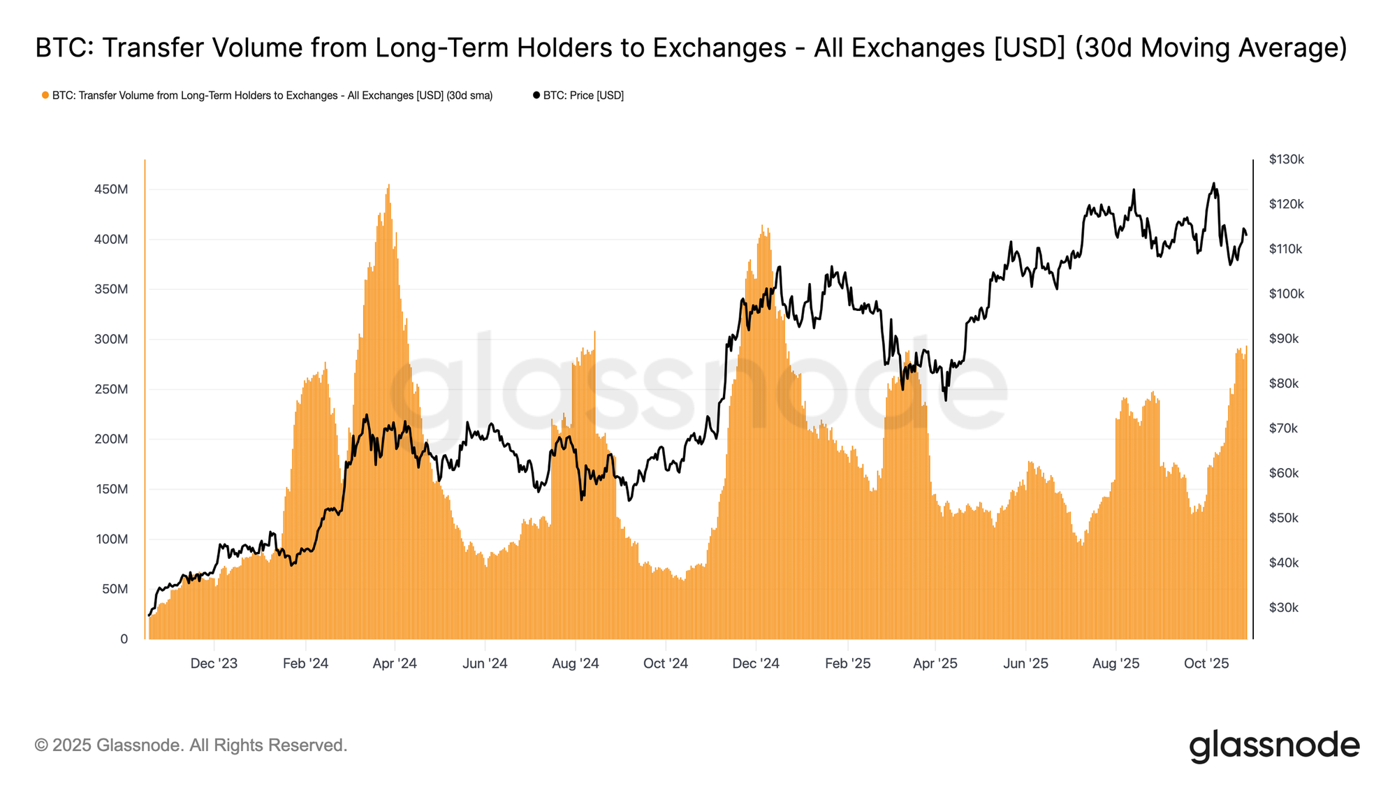 Uzun vadeli yatırımcı satışlarının yoğunluğunu ölçmek için, deneyimli yatırımcıların olası satış için hareket ettirdiği coinlerin değerini gösteren Uzun Vadeli Yatırımcılardan Borsalara Transfer Hacmi (30-GH) metriğine başvurabiliriz. Bu metrik, Kasım 2024'ten bu yana görülen 100-125 milyon USD'lik taban seviyesinin iki katından fazlasına denk gelerek günlük yaklaşık 293 milyon USD'ye yükselmiştir.