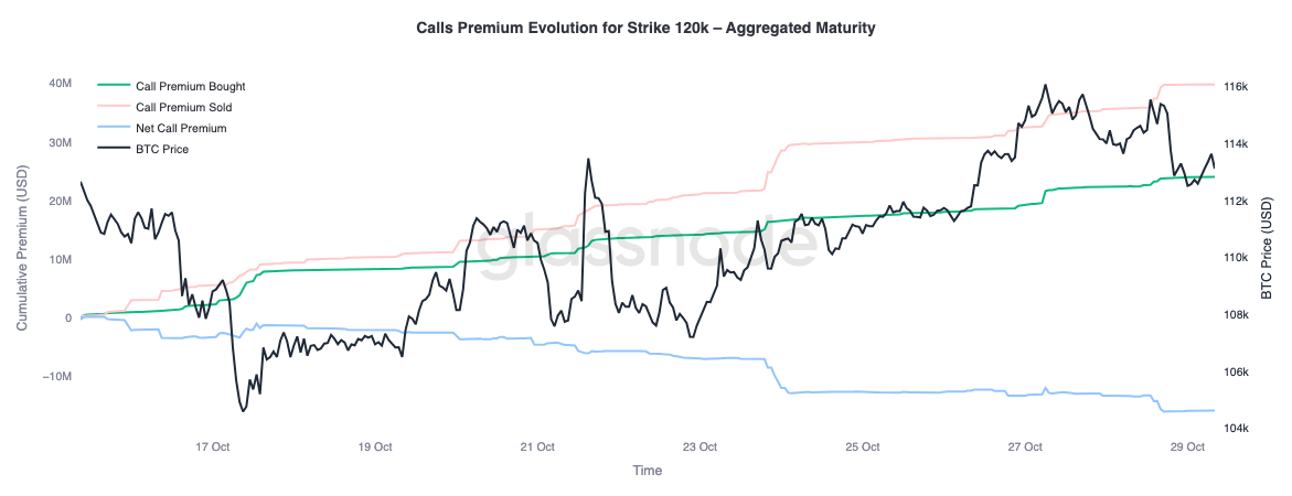 Çarpıklığın normale dönmesiyle birlikte dikkatler, yatırımcıların primleri nereye yönlendirdiğine kaydı. Call aktivitesi artık baz fiyatlara göre belirgin farklılık gösteriyor. 115K USD baz fiyatında, net alım yönünde ödenen call primi pozitif kalmaya devam ediyor; bu da yatırımcıların son iki haftadaki fiyat toparlanmasıyla birlikte kısa vadeli yükseliş için sürekli prim ödediğini gösteriyor. Buna karşılık, 120K USD baz fiyatında, satılan call primleri alımları aşarak net primin negatif olmasına neden oluyor.