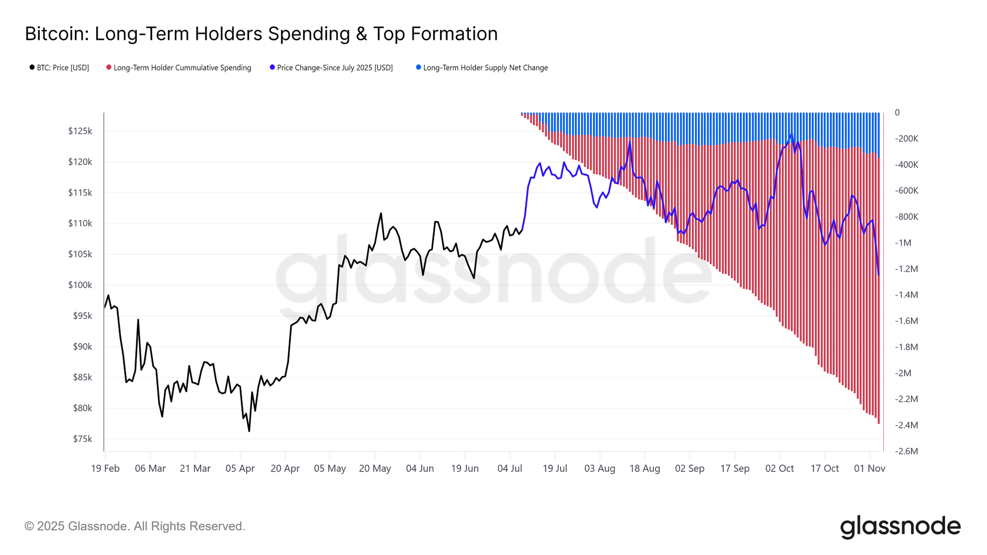 Nispeten sınırlı kayıp şiddetine ve 126 bin dolarlık tüm zamanların en yüksek seviyesinden ılımlı %21'lik bir düşüşe rağmen, piyasa uzun vadeli yatırımcıların sessiz ancak sürekli satış baskısı altında kalmaya devam ediyor. Bu eğilim, Temmuz 2025'ten bu yana devam ediyor ve Bitcoin'in Ekim başında yeni bir zirve yapması, birçok kişiyi şaşırtmış olsa da dağıtım sürüyor.