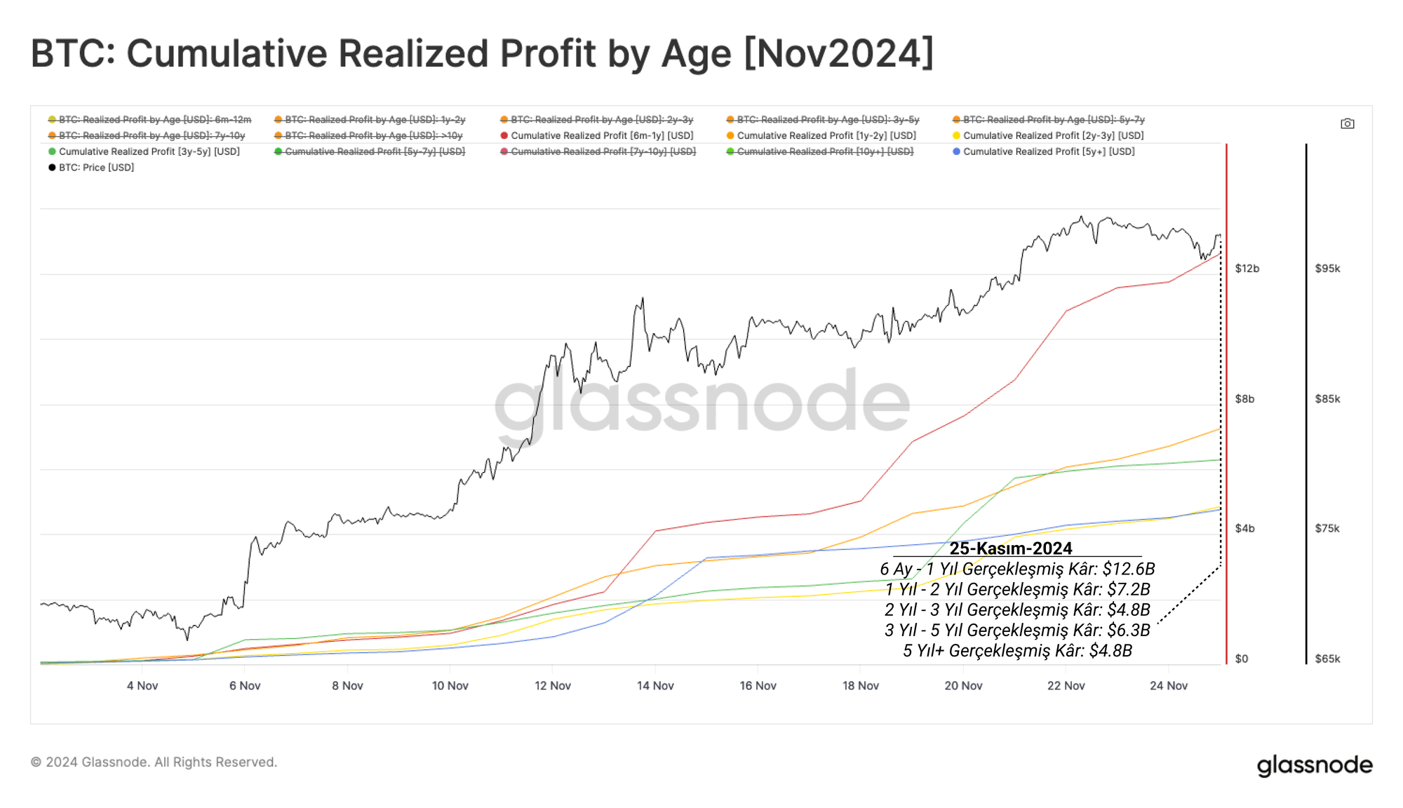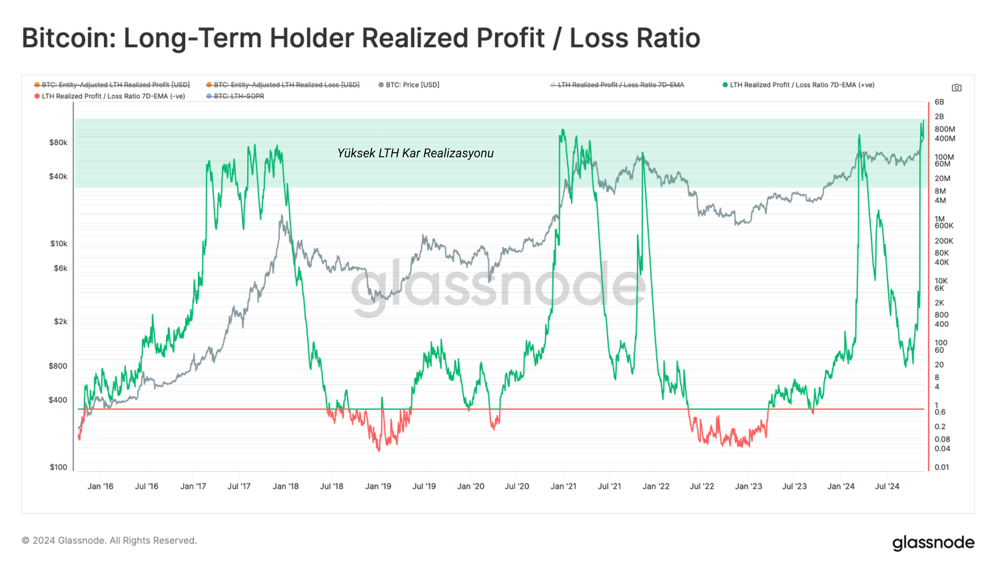 Bitcoin, art arda yeni tüm zamanların en yüksek seviyelerine ulaşarak,$100.000 hedefine sadece bir adım uzaklıktadır. Bu hızlı fiyat artışı,yatırımcıların gerçekleşmemiş kârlarında önemli bir artışa yol açmış ve uzun vadeli yatırımcılar, bu duruma yanıt olarak satışlarını artırmıştır.