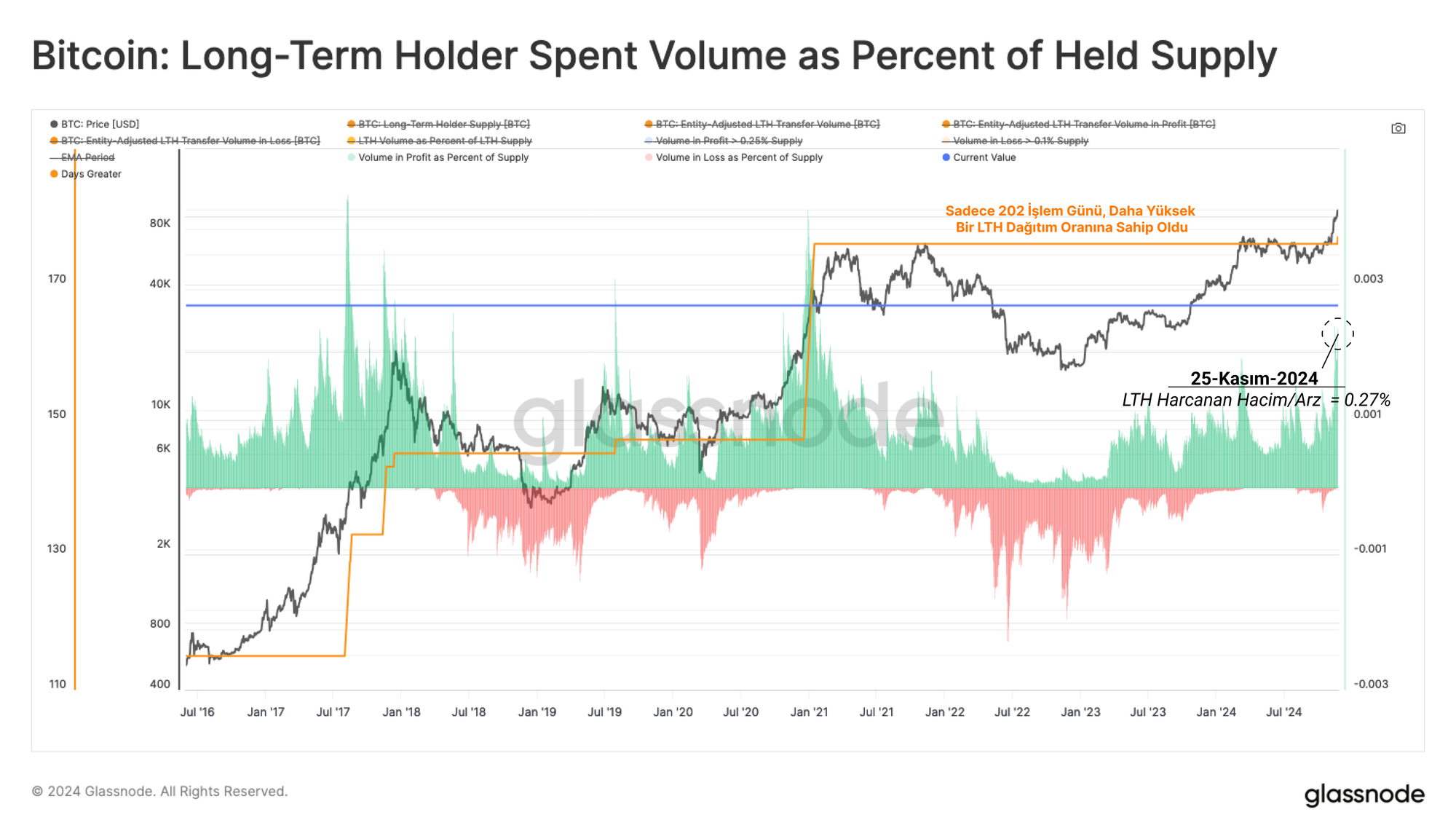 İlginç bir şekilde, bu göreli LTH harcama oranının, Mart 2024 ATH seviyesindekinden daha yüksek olduğu görülüyor. Bu durum, daha agresif bir dağıtım kampanyasını işaret ediyor.