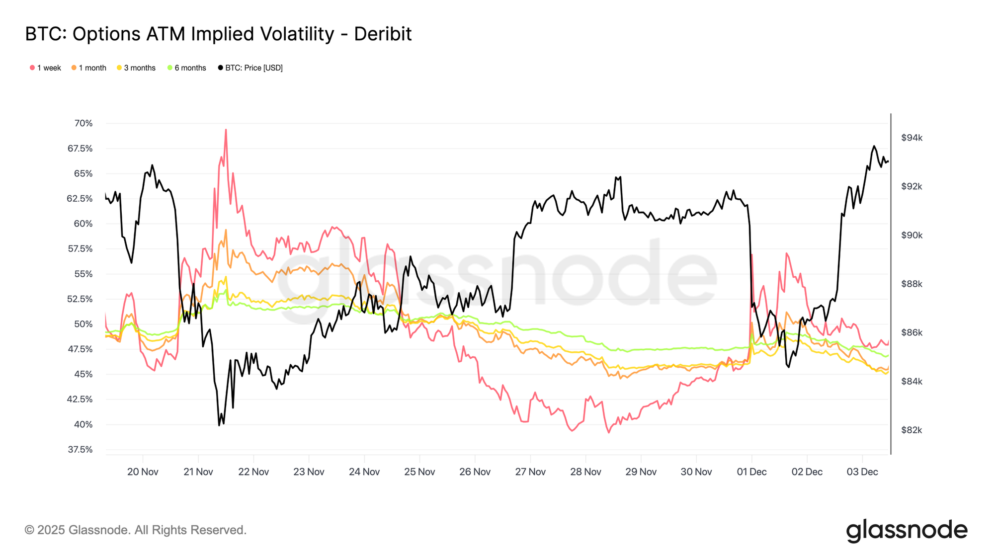 Opsiyon piyasasına geçildiğinde, içsel oynaklık (implied volatility), yatırımcıların gelecekteki belirsizliği nasıl fiyatladığını net bir şekilde gösteren bir pencere sunuyor. Başlangıç noktası olarak, piyasanın gelecek fiyat hareketi beklentisini yansıttığı için içsel oynaklığı takip etmek faydalıdır. İçsel oynaklık, geçen haftaki yüksek seviyelerin ardından yeniden düşük seviyelere ayarlandı. Fiyat 92K direncinin üzerine çıkmakta zorlandı ve toparlanmanın devam etmemesi oynaklık satıcılarının yeniden devreye girerek tüm vadelerde içsel oynaklığı aşağı itmesine yol açtı.