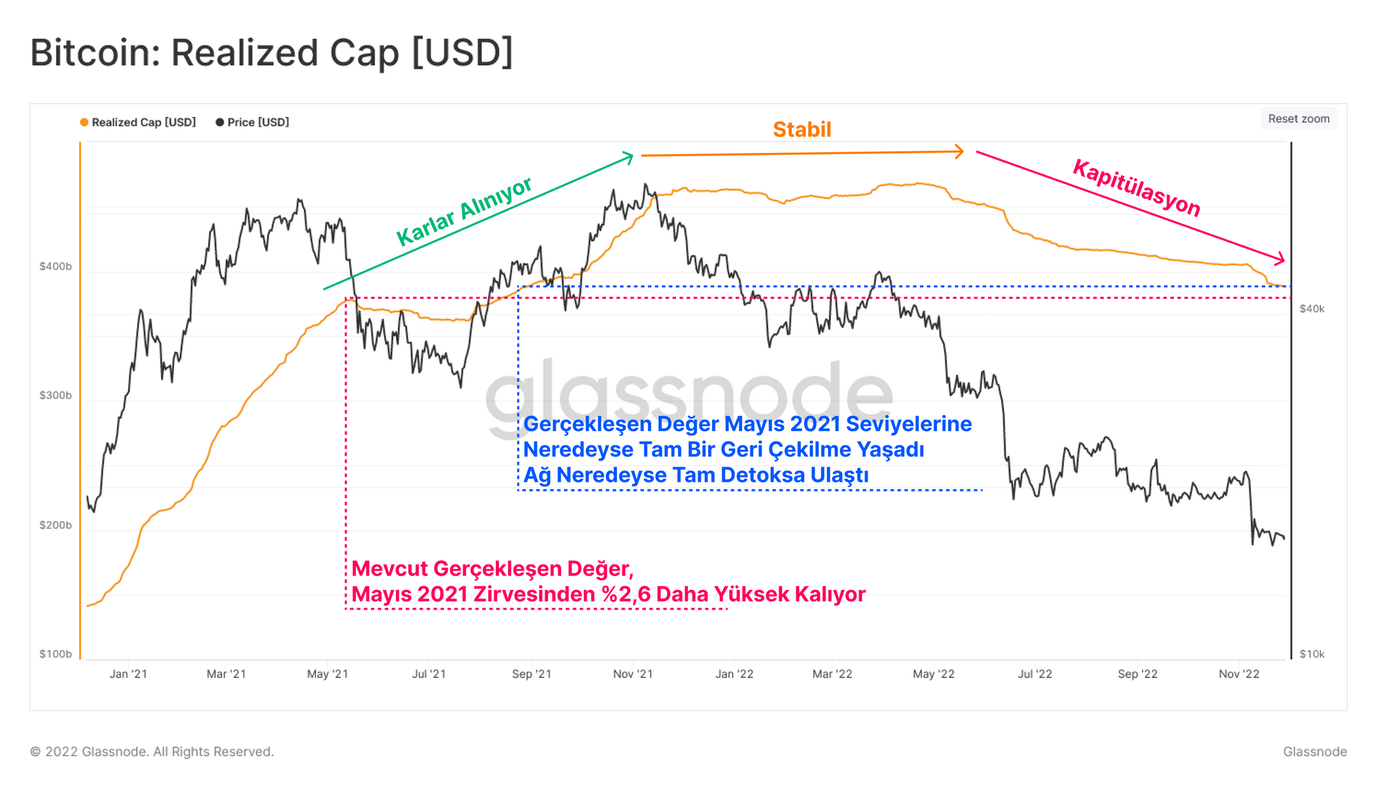 Dijital varlık tarihindeki en büyük kaldıraç azaltma olaylarından birinin ardından, Bitcoin Gerçekleşen Değer öyle bir düşüş gösterdi ki, Mayıs 2021'den bu yana tüm sermaye girişleri şimdi temizlendi. Onchain aktivitede buna bağlı bir artış var, ancak önemli miktarda takipten yoksun.