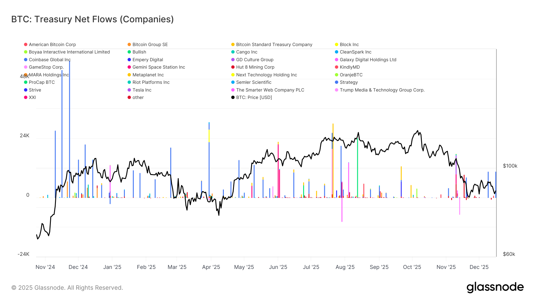 Önemli olarak, son fiyat zayıflığı, hazine birikiminde koordineli bir artışı tetiklemedi; bu da çoğu şirketin disiplinli ve fiyata duyarlı kaldığını gösteriyor. Sonuç olarak, kurumsal hazineler başlık akış oynaklığına katkıda bulunuyor ancak henüz güvenilir, döngü genelinde yapısal bir talep kaynağı olarak hareket etmiyorlar.