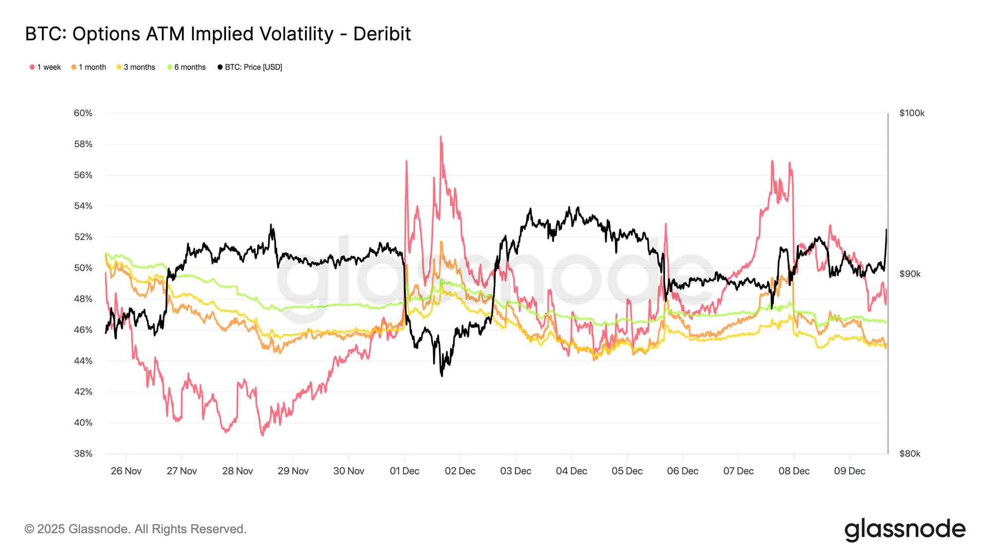 Bu baskıya rağmen, sabırlı talep şimdiye kadar Gerçek Piyasa Ortalaması'nı (~81.300 dolar) savunarak daha derin bir çöküşü engelledi. Spot talep seçici kalmaya, kurumsal hazine akışları düzensiz olmaya ve vadeli işlem pozisyonları inanç yeniden inşa etmek yerine risk azaltmaya devam ediyor. Opsiyon piyasaları bu sınırlı aralık rejimini güçlendiriyor: kısa vadeli oynaklık sıkışıyor, aşağı yönlü risk fiyatlanmaya devam ediyor ancak istikrarlı, ve vade odaklı pozisyonlama fiyat hareketini Aralık sonuna kadar sabitliyor.