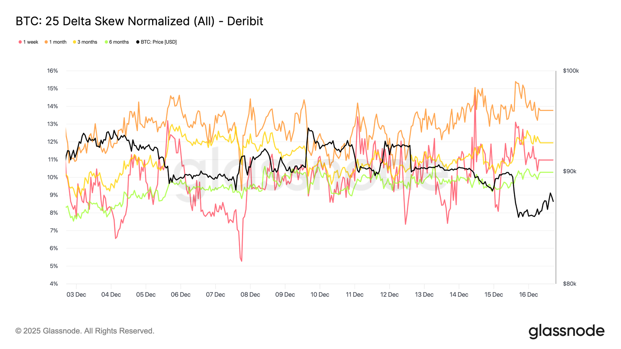 Yumuşayan kısa vadeli oynaklıkla uyumlu olarak, 25-delta skew vade boyunca geniş ölçüde istikrarlı kaldı; kısa vadede implike oynaklık sıkışmış olsa da put bölgesinde kaldı. Bu, aşağı yönlü put'ların call'lara göre primli işlem görmeye devam ettiğini, ancak bu primin genişlemediğini gösteriyor. Özünde, yatırımcılar aşağı yönlü korumayı artırmaktan ziyade sürdürüyor.