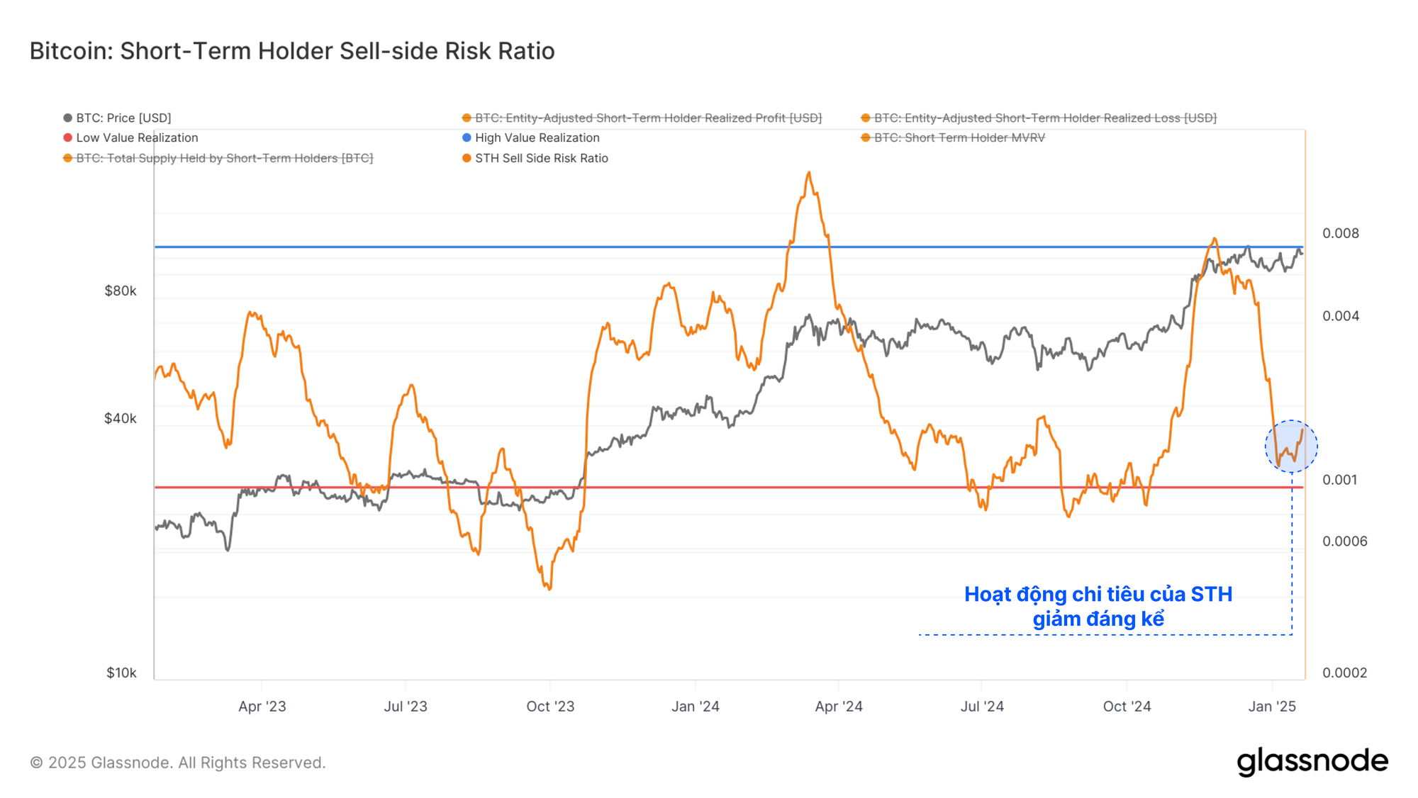 Hoạt động chi tiêu của Người nắm giữ ngắn hạn đã giảm đáng kể trong những tuần gần đây, khiến chỉ số này giảm mạnh. Điều này thường báo hiệu rằng tất cả các sự kiện chốt lời và lỗ mà các nhà đầu tư đã lên kế hoạch, hiện đã được thực hiện. Nó có xu hướng báo hiệu rằng thị trường đang ở gần trạng thái cân bằng cục bộ và là dấu hiệu báo trước cho làn sóng biến động tiếp theo.